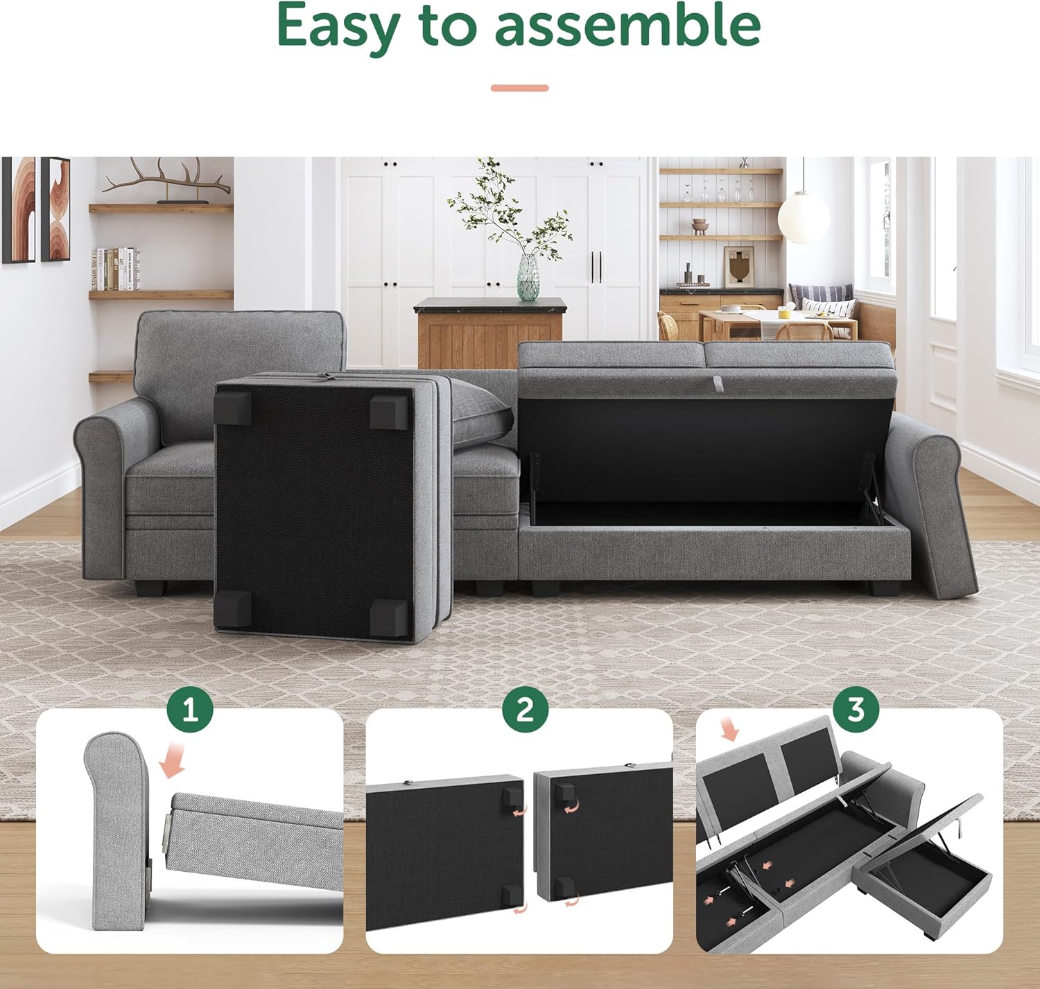 - Hidden Storage Space: The storage space under each seat of the sectional sofa can not only store children's toys, but also store blankets and remote controls, making the room look neat and clean