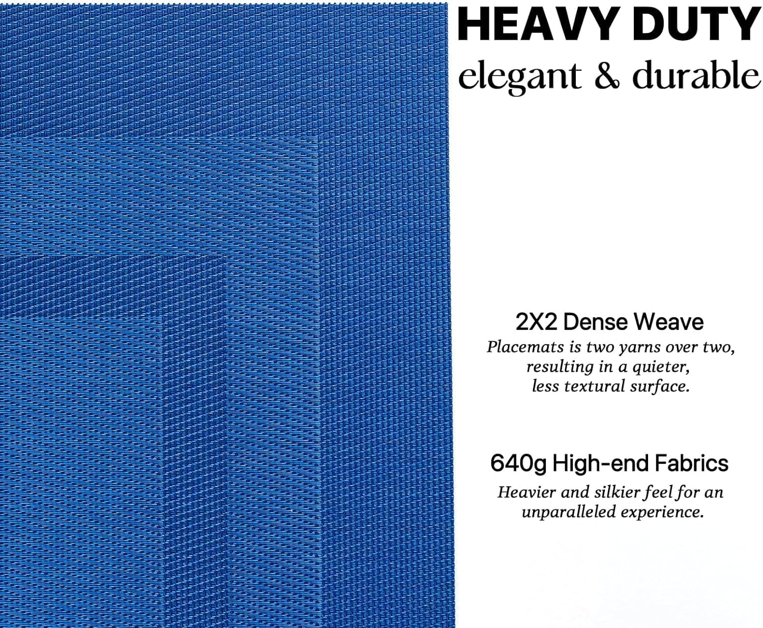 - HEAVY-DUTY:We uses the German-imported higher grammage vinyl material (Specialty PVC)than other placemats on the market,plus the precise,dense weave craftsmanship to give the woven placemats a thicker feel and make the place mats long-lasting.