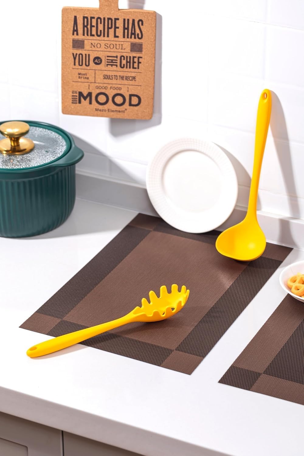LEXMORE PlaceMats Set of 12 Vinyl/Plastic Woven Place Mats for Kitchen Table Indoor/Outdoor Washable PlaceMat Wipeable Dining Table Mats(Brown Cube)