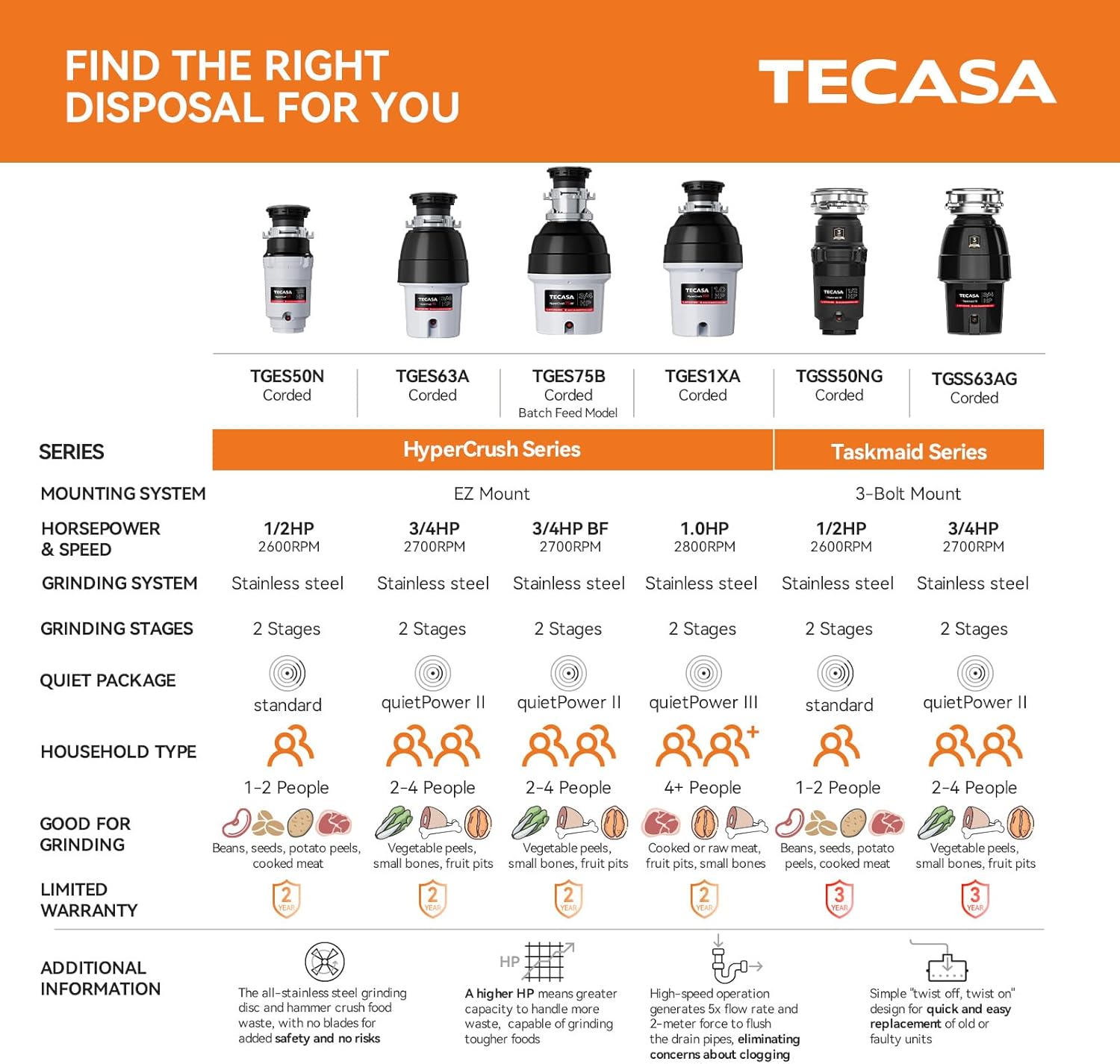 1/2 HP Garbage Disposals, TECASA Continuous Feed, Stainless Steel Food Waste Grinding System for Kitchen Sink Food Waste, Power Cord Included, UL Certified - HyperCrush 50