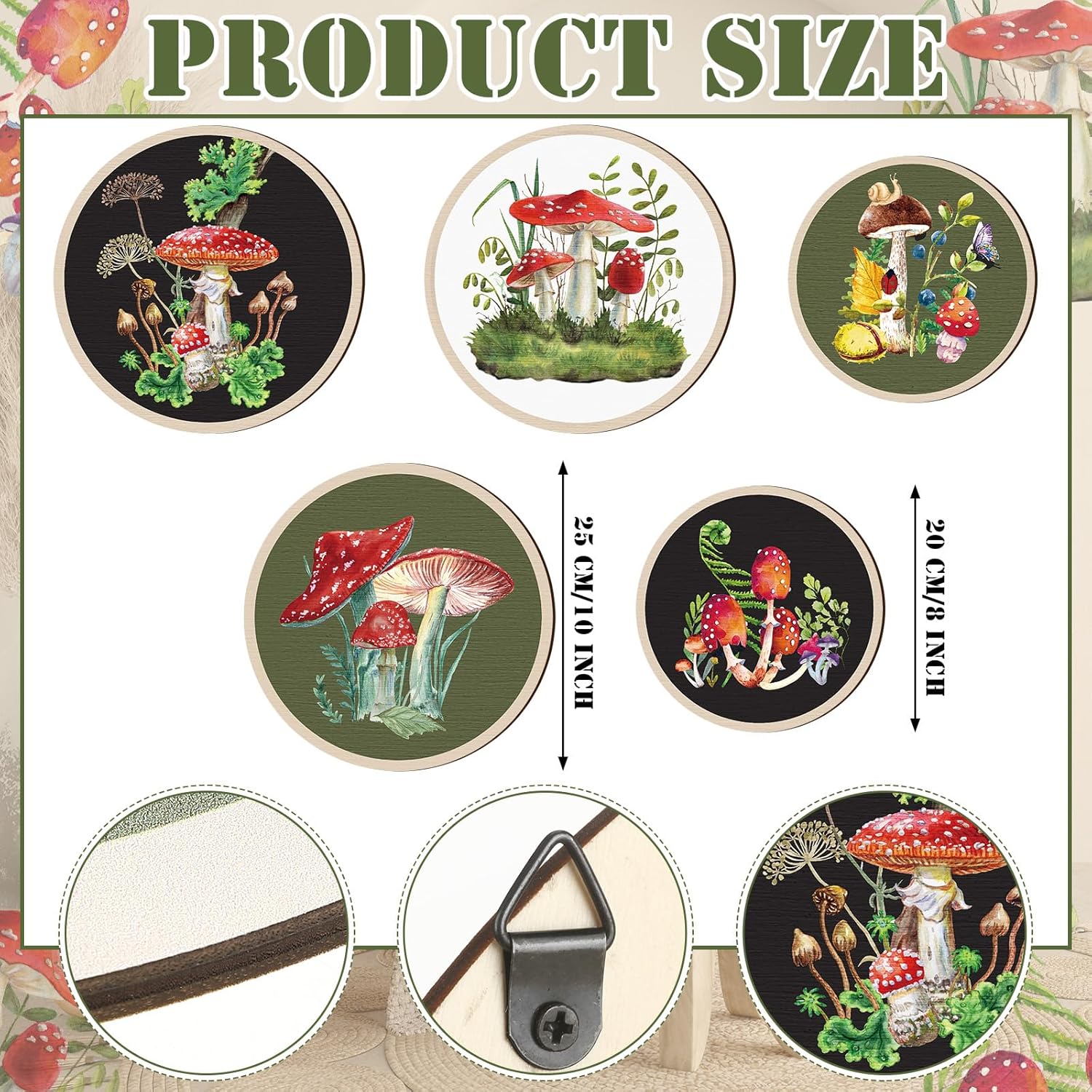 - Proper Size for Display: there are 2 kinds of sizes of the aesthetic wall art, 3 bigger ones measure about 10 inches/ 25 cm in diameter, and 2 smaller ones are about 8 inches/ 20 cm in diameter, all of them are about 0.2 inch/ 0.5 cm in thickness, proper size to catch people's attention