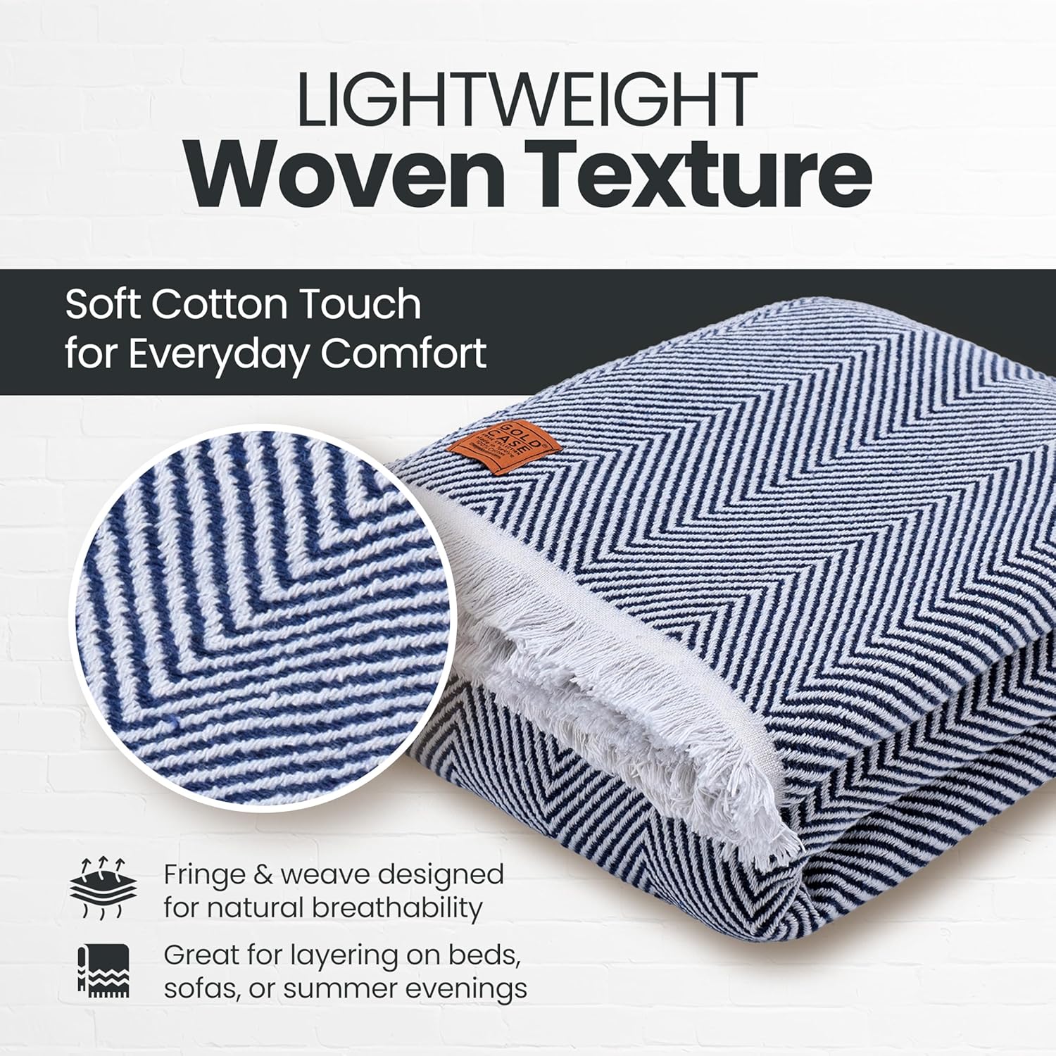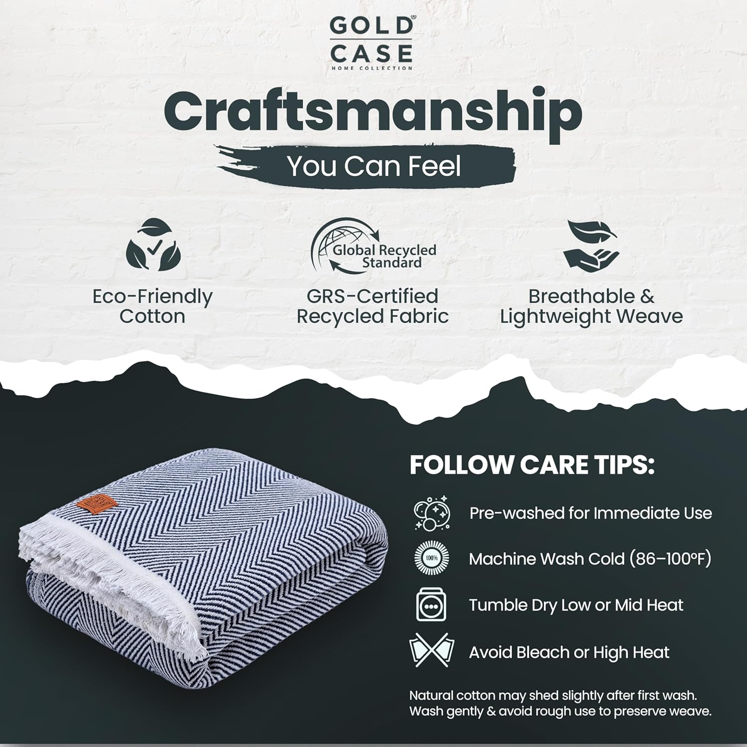 Gold Case Throw Blanket for Bed – 100% Recycled Turkish Cotton Bed Blanket – Decorative Throw Cotton Blankets for Living Room & Bedroom – Elegant Navy Blue Woven Queen Blankets – 90x90