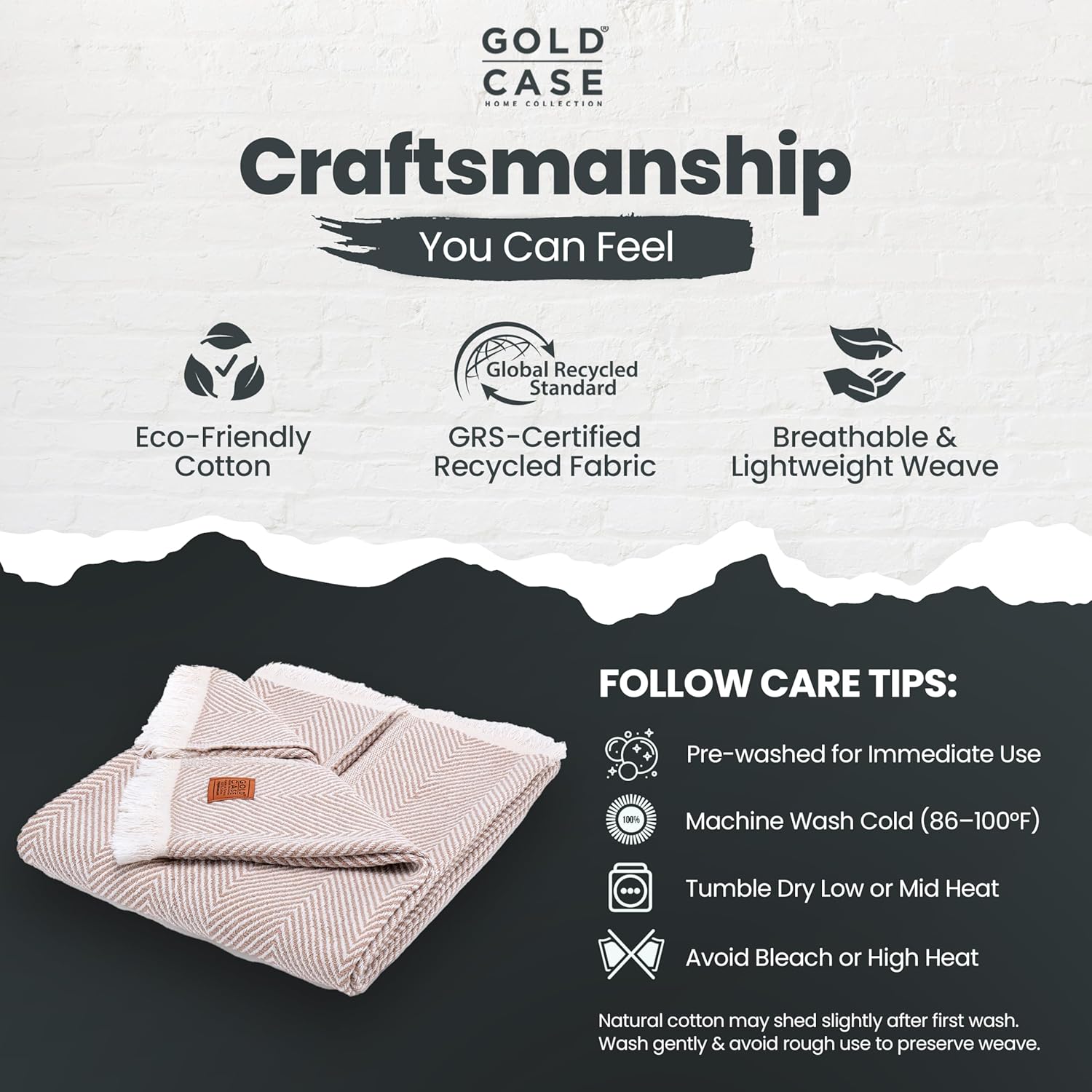 Gold Case Throw Blanket for Couch – 100% Recycled Turkish Cotton Blankets & Throws – Elegant Decorative Throw Blankets for Living Room Sofa – Woven Throws for Couch – Elegant Beige – 50x60