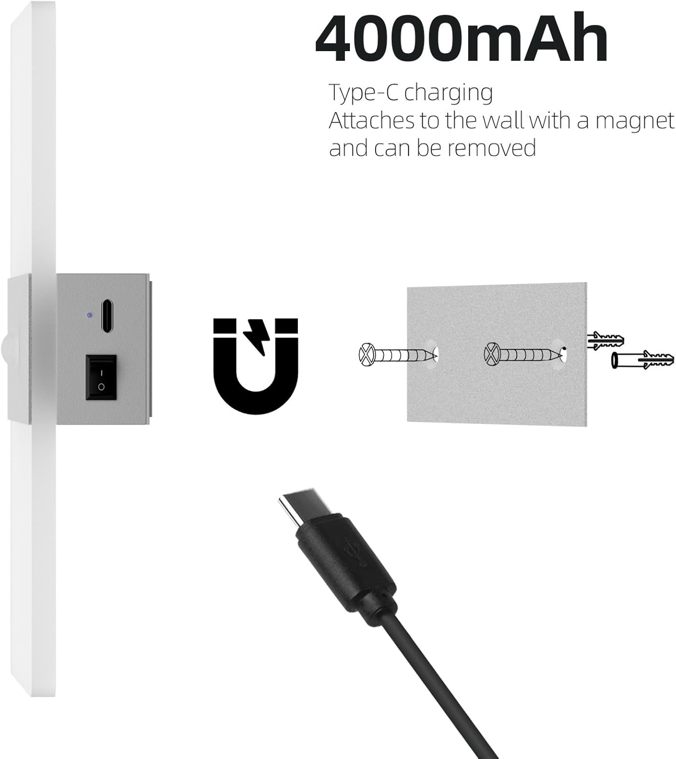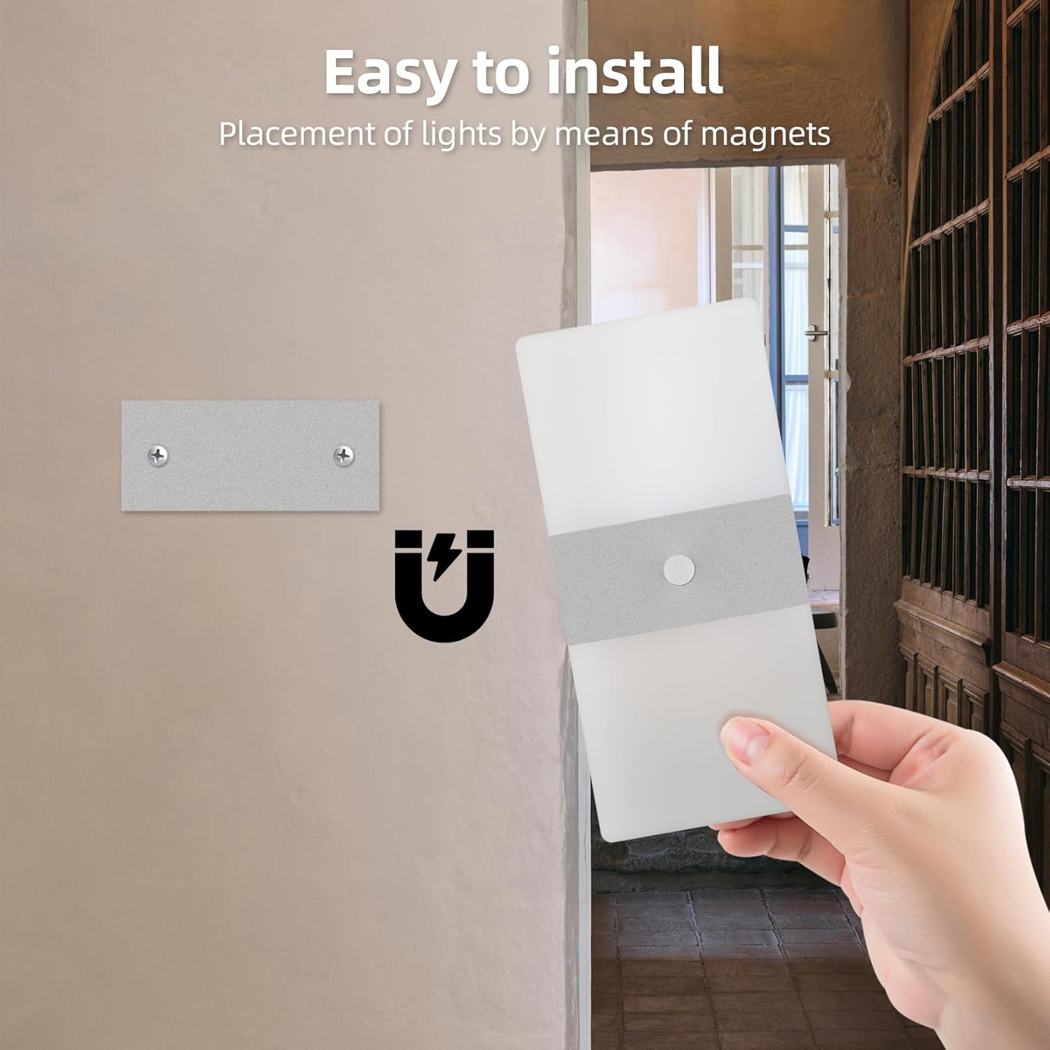 - š”ćEasy Installationć1.Use the included screws to secure the iron piece of the base to the wall.2.Magnetic adsorption, the battery wall light lamp body can be easily adsorbed to the base by the built-in magnet, so it can be effortlessly mounted on any iron surface.