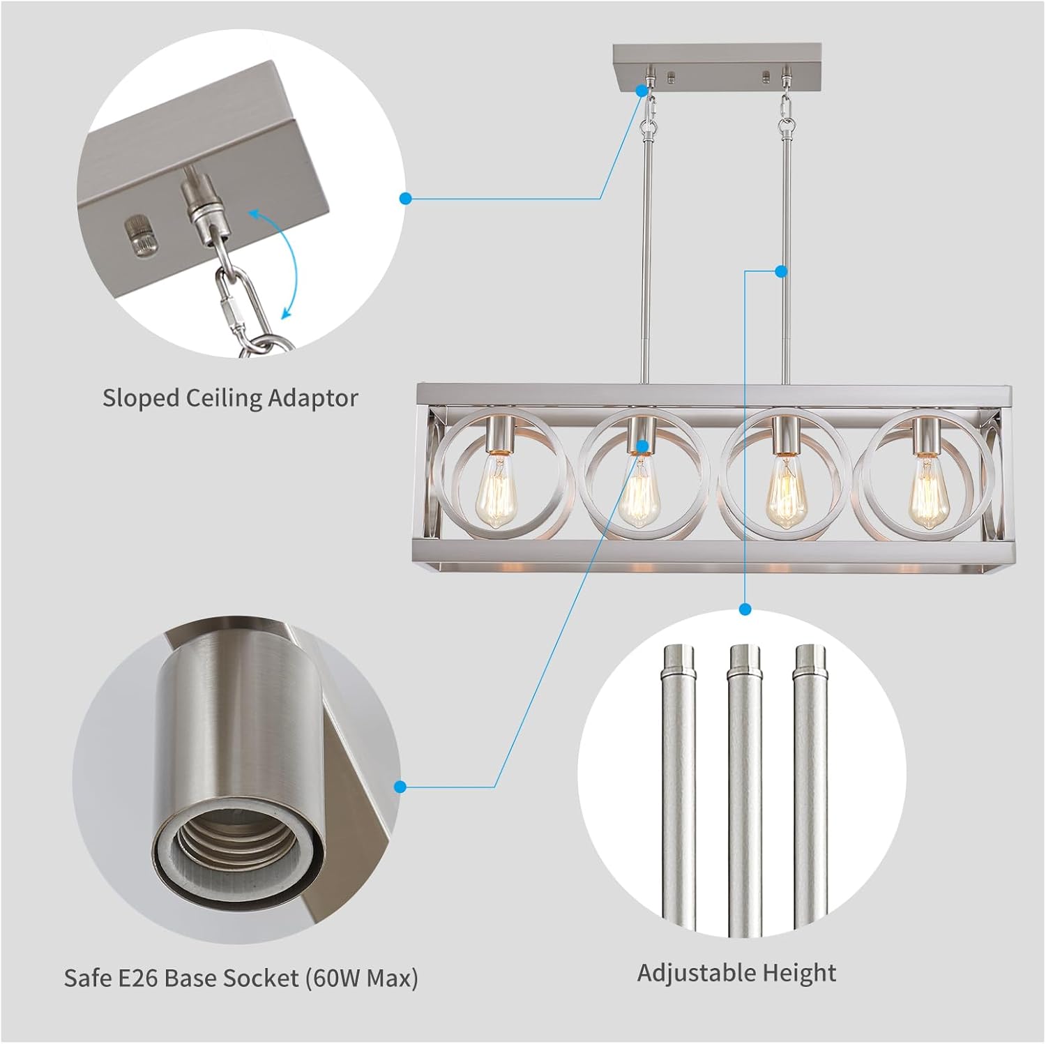 XINGQI Linear Chandelier Brushed Nickel Kitchen Island Light Fixtures 31.5" Rectangle Dining Room Chandeliers, Farmhouse Hanging Large 4-Light Rustic Metal Living Room Office Pendant Lighting