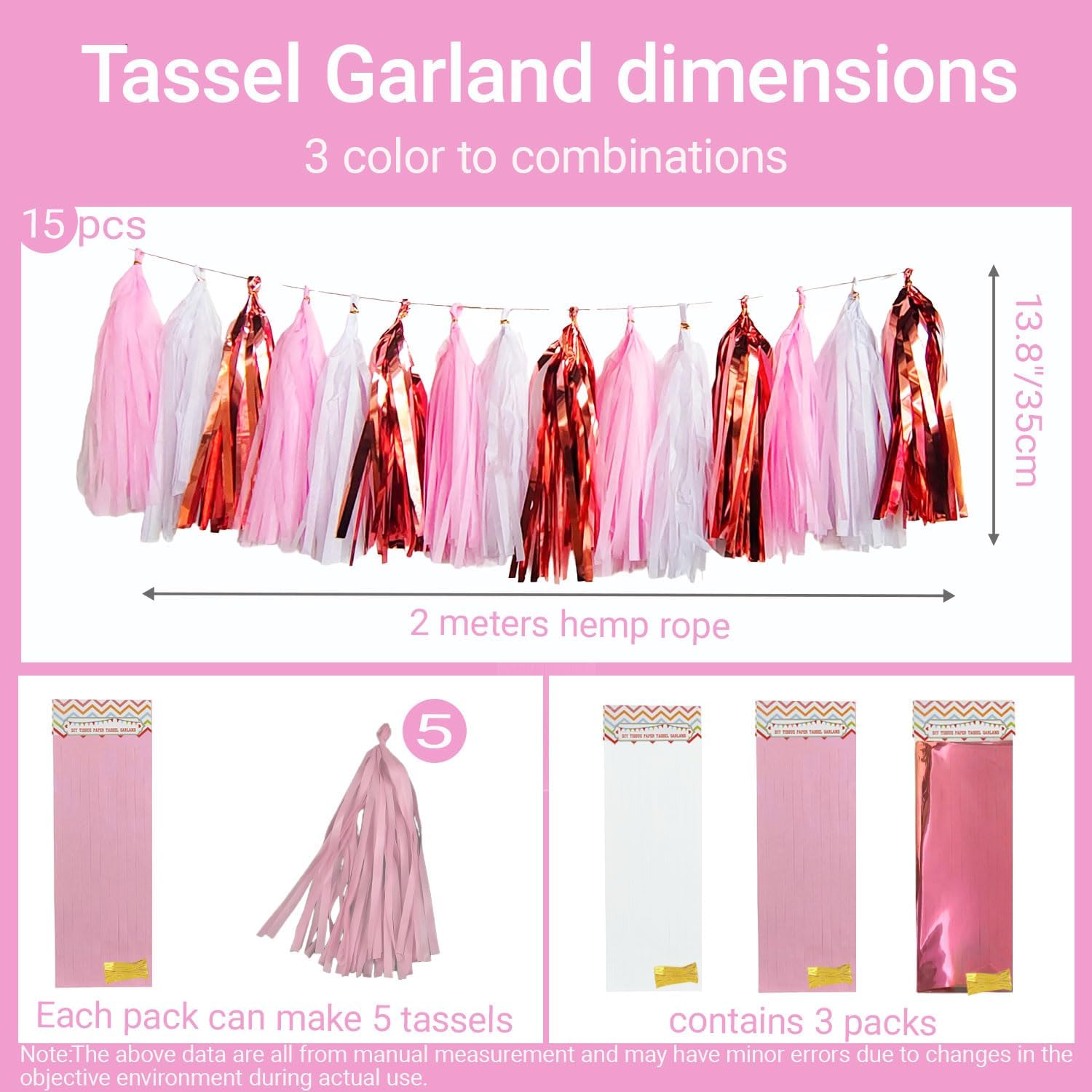 - One garland includes: 15 tassels (Rose Gold/Pink/White).5 pcs per color. Each tassel is about 12" long after assembled. And each garland comes with a 10ft long String for hanging these tassels