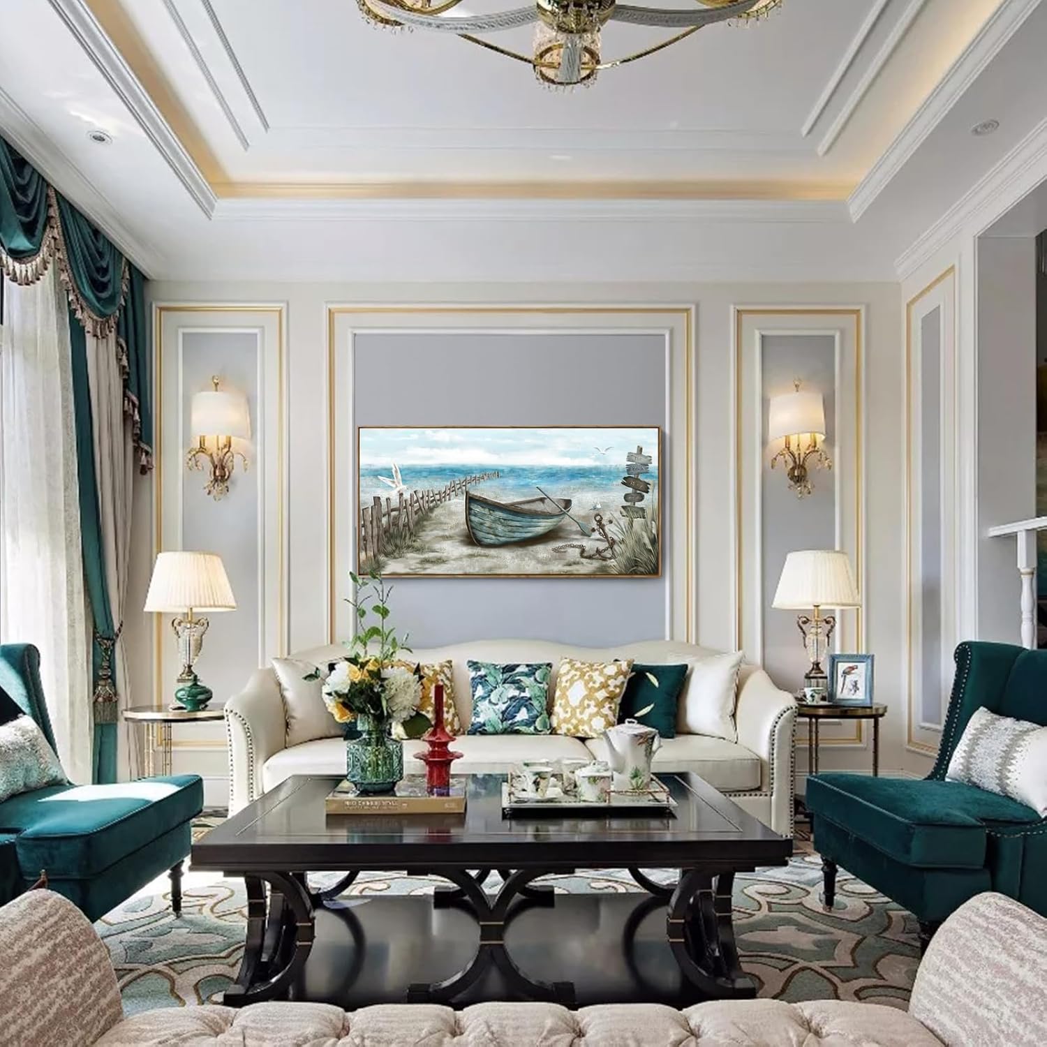 Large Framed Wall Art for Living Room Coastal Canvas Picture Seagull Vintage Boat Artwork Ocean Sea Bird Canvas Print Nautical Rowboat Blue Teal Rustic Beach Themed Farmhouse Bedroom Office Decor