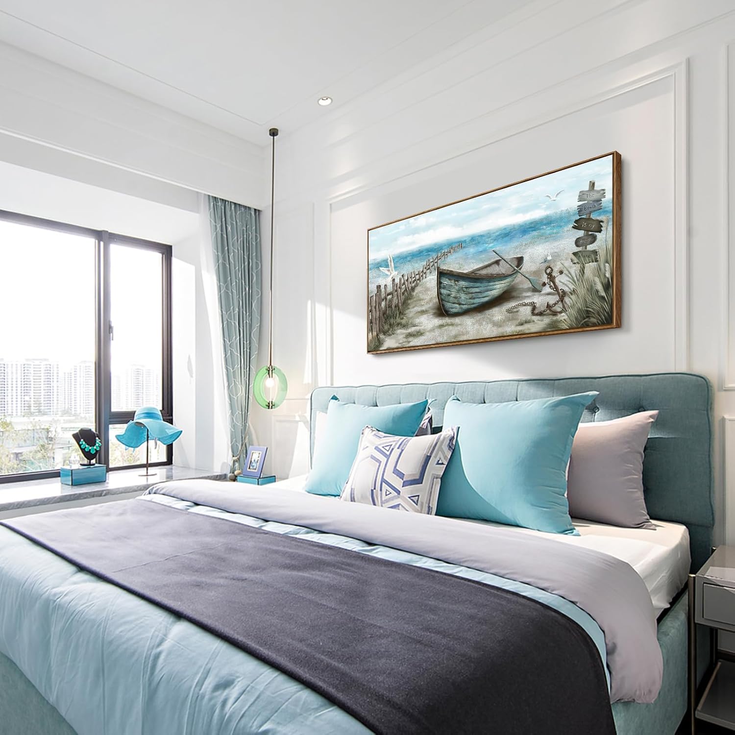 - Calming Seashore Aesthetic: This serene large framed wall art captures sea bird resting on the rowboat. Behind the boat is blue ocean with the soaring seagulls. The nautical palette of blues, sand beige, tan, and fluffy white clouds provide a soothing feel. Hang this beach themed framed wall art up for a calming vibe, and escape to the beach each day after work in the comfort of your home.