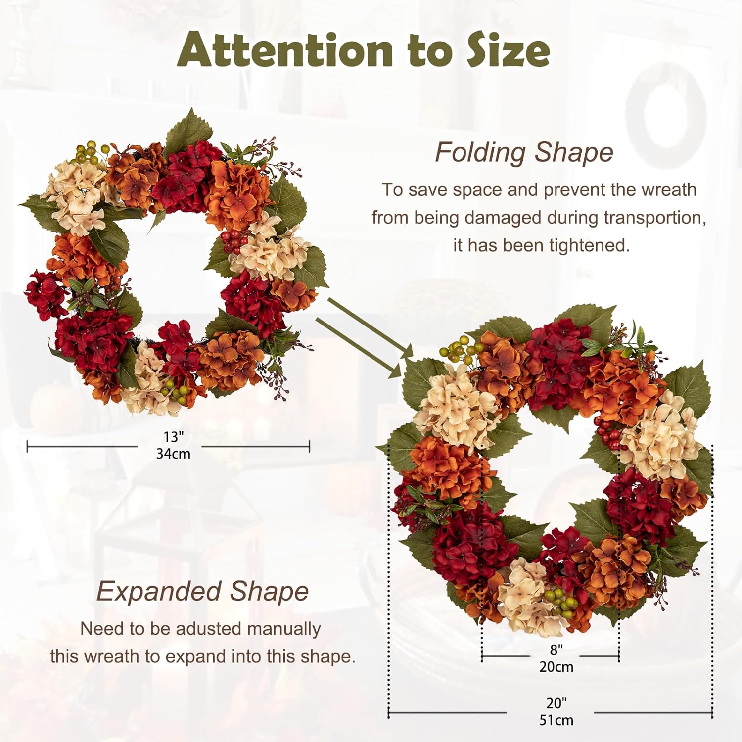 - Autumn Decorations - The large front door wreaths are maintenance free, it can be used for several seasons and don't need to spend time to maintain. The hanging autumn wreath will make a great addition to your home decoration, can help you keep the fall theme, it is great for decortating your living room, bedroom, dining room, kitchen, dining room, stairs, foyer, front hall, yard, garden, hotel, coffee shop, bookstore, office, etc. This fall hydrangea wreath will be brighten up your space