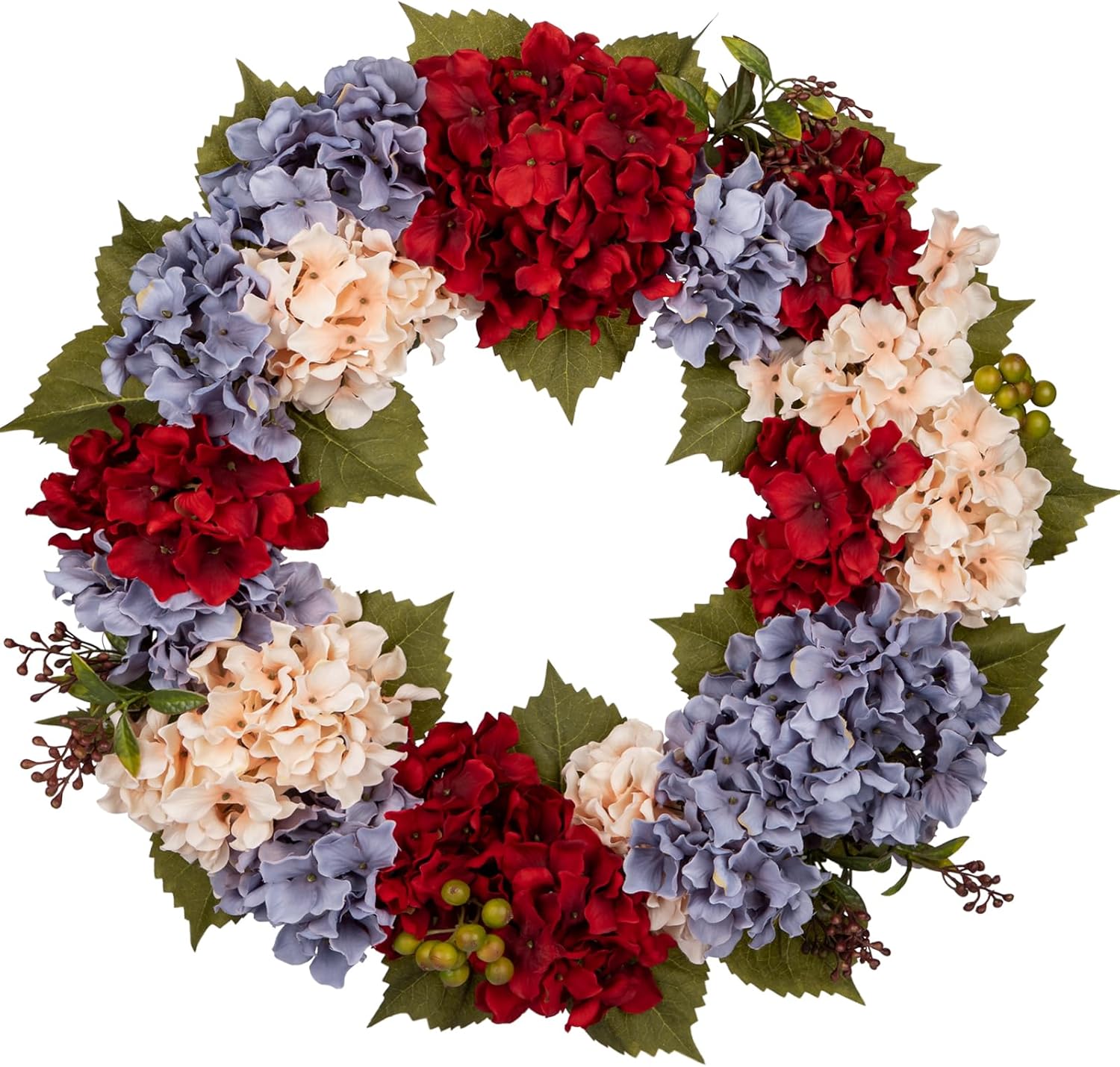- Premium Material - Our wreaths for front door are 100% handmade with great attention to detail and craftsmanship, the hydrangea flowers are made of fabrics with a nice hand feel, the green leaves and berries are crafted from 3D printed silk and polystyrene material respectively, the wildflower branches are made of plastic, and the base wreath are made of PVC, this farmhouse wreath has a lifelike appearance and real touch, it is uneasy to deform or fade, it can be used all year round