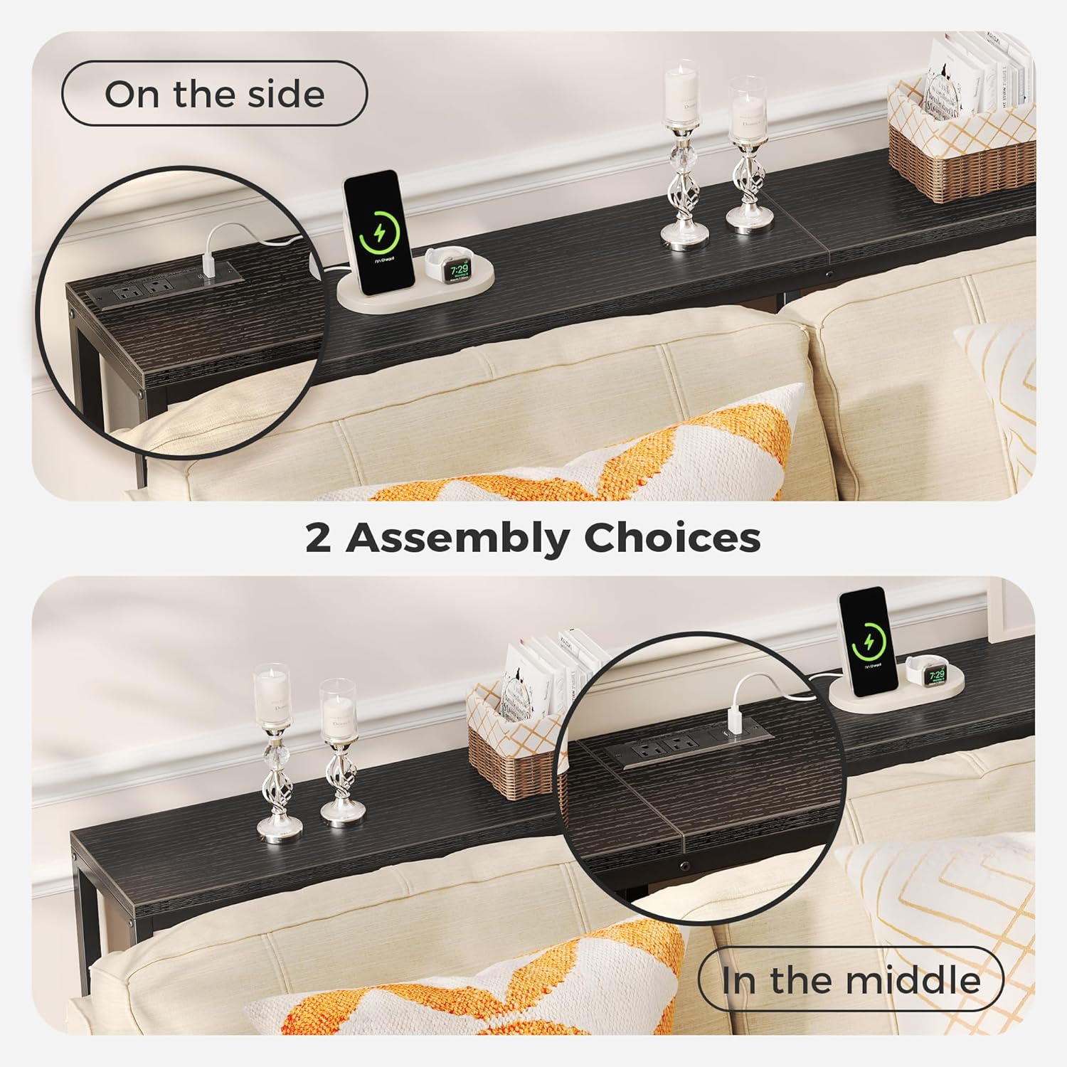 - [No Low Battery Warnings]: Imagine lounging on your sofa and brushing your phones to relax after a busy week. Don’t let low battery disappoint you. Let this sofa table narrow long with 2 AC outlets, 1 USB port and 1 Type-C port provide close-at-hand power