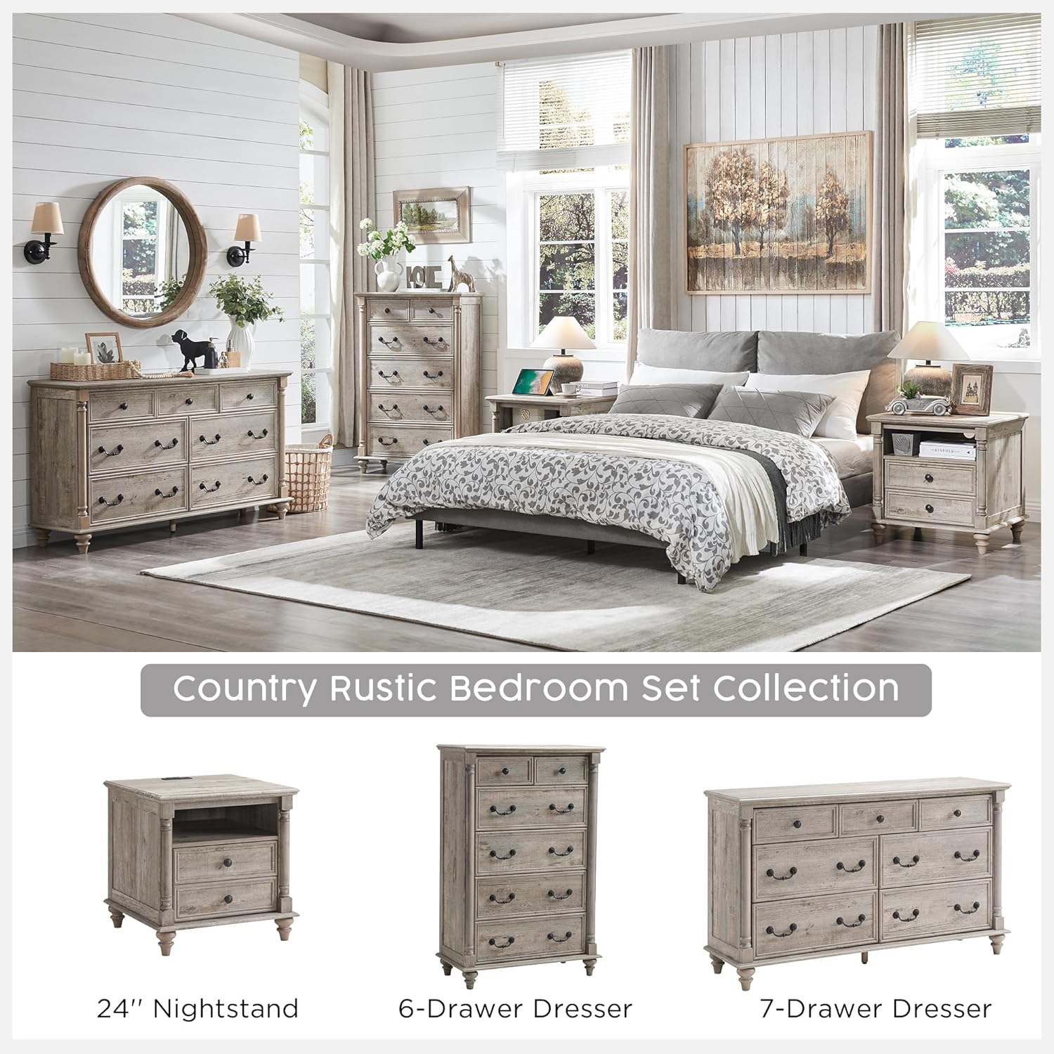 - EXQUISITELY CRAFTED: Measuring 24''W* 24'' D *24'' H. With a replicated light rustic wood grain that stands out against the distressed finish, this transitional nightstand brings a warm presence to your bedroom/living room. Beautified with 4 solid wood feet & and the solid wood column decor which is wonderfully easy on the eyes. Paired with the unique antique-tone pulls and recessed 4-in-i charging station on the tabletop, made for years of satisfaction.