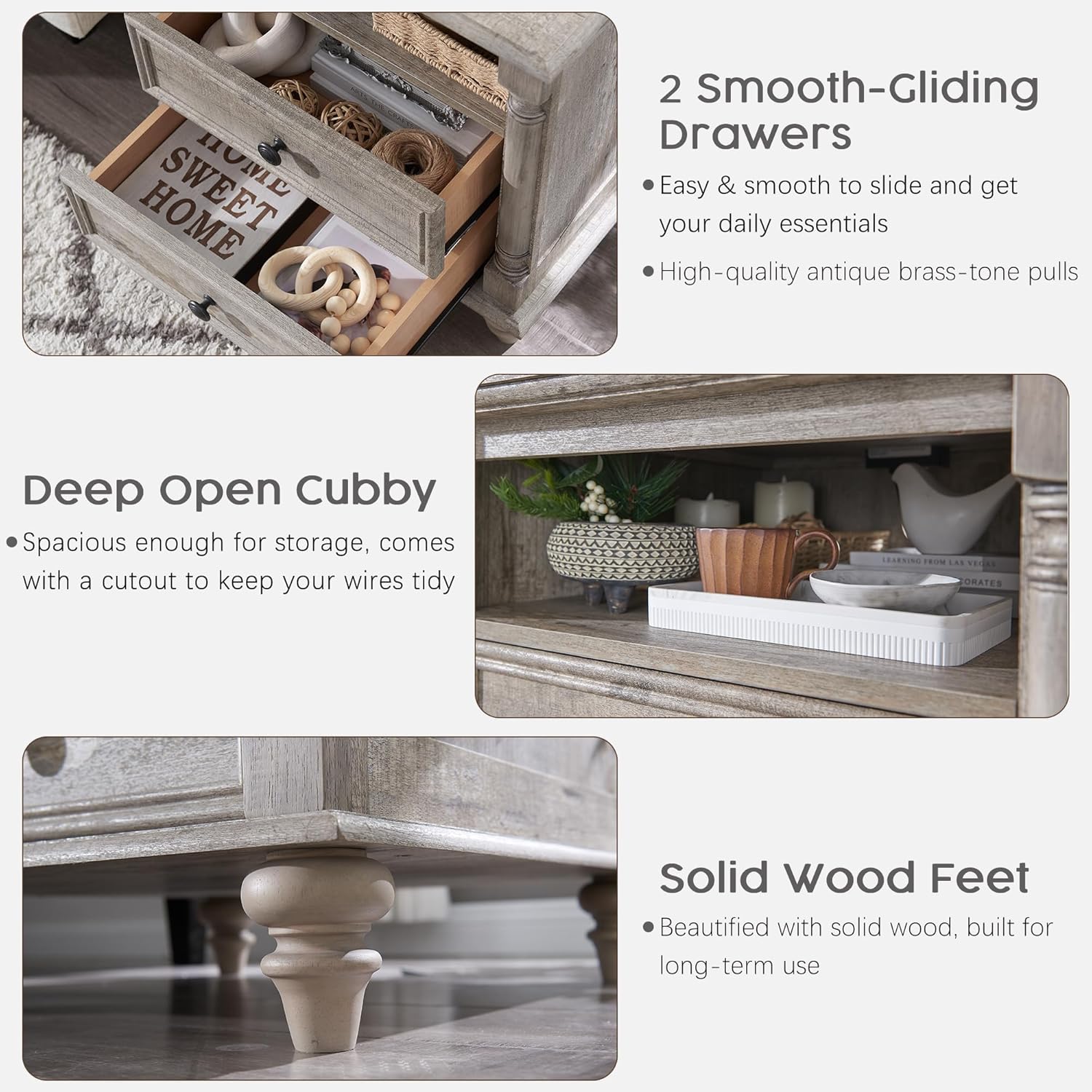 T4TREAM 24'' Farmhouse End Table w/4 Solid Wood Feet, Large 2 Drawers Wide Sofa Side Table with Charging Station, Tall Rustic Wood Square Nightstand for Living Room, Bedroom, Office, Light Rustic Oak