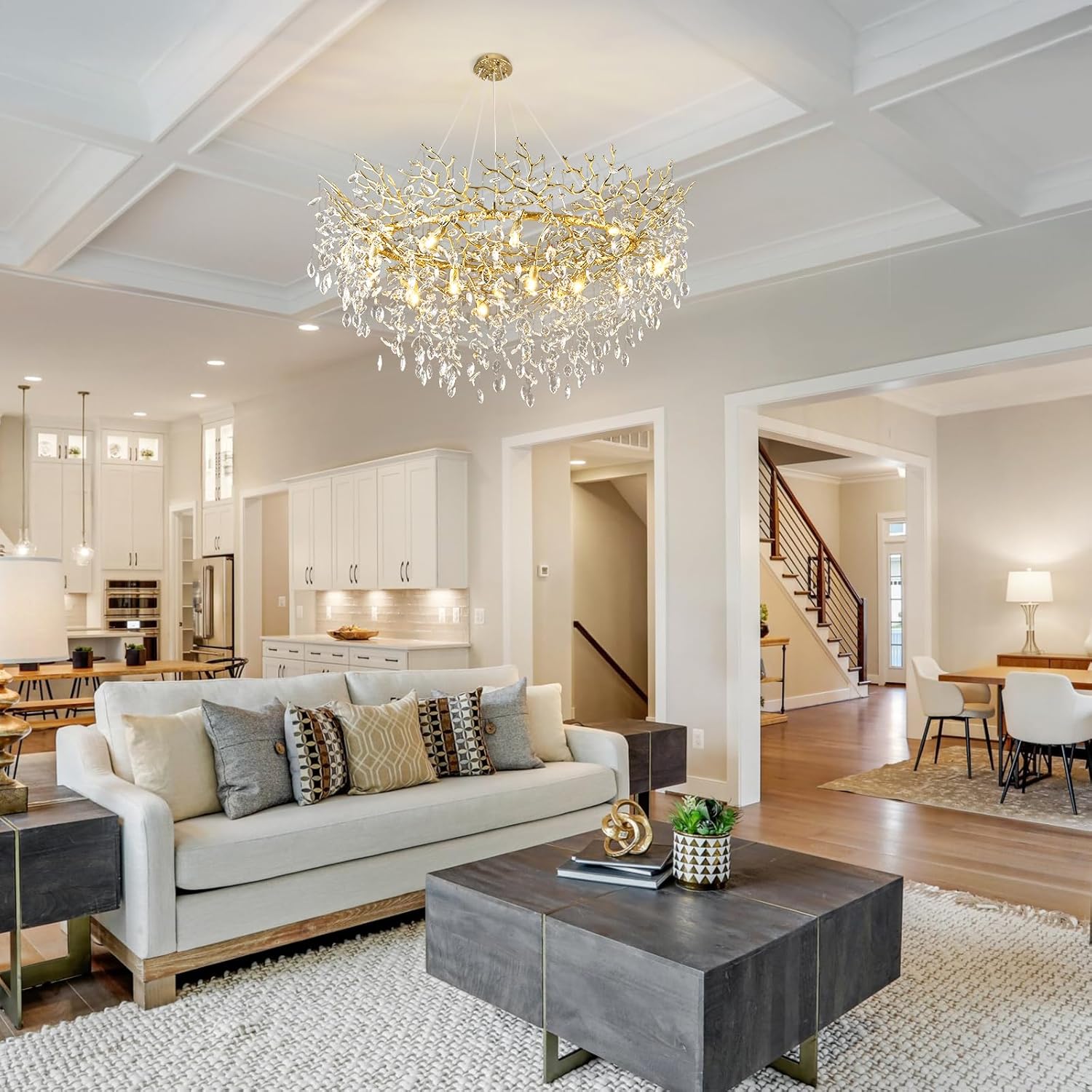 - Application Space:This round crystal chandelier is perfect for living rooms, entryways, high-ceiling spaces, and stairwells. Its size is ideal for installation in open-concept spaces.Crystal chandelier resembles a golden tree, lighting up and warming the entire house while also serving as a stunning decorative piece. The chandelier's ceiling canopy is compatible with both flat and sloped ceilings, making it perfect for the dining room, living room,bedroom, or any other space.