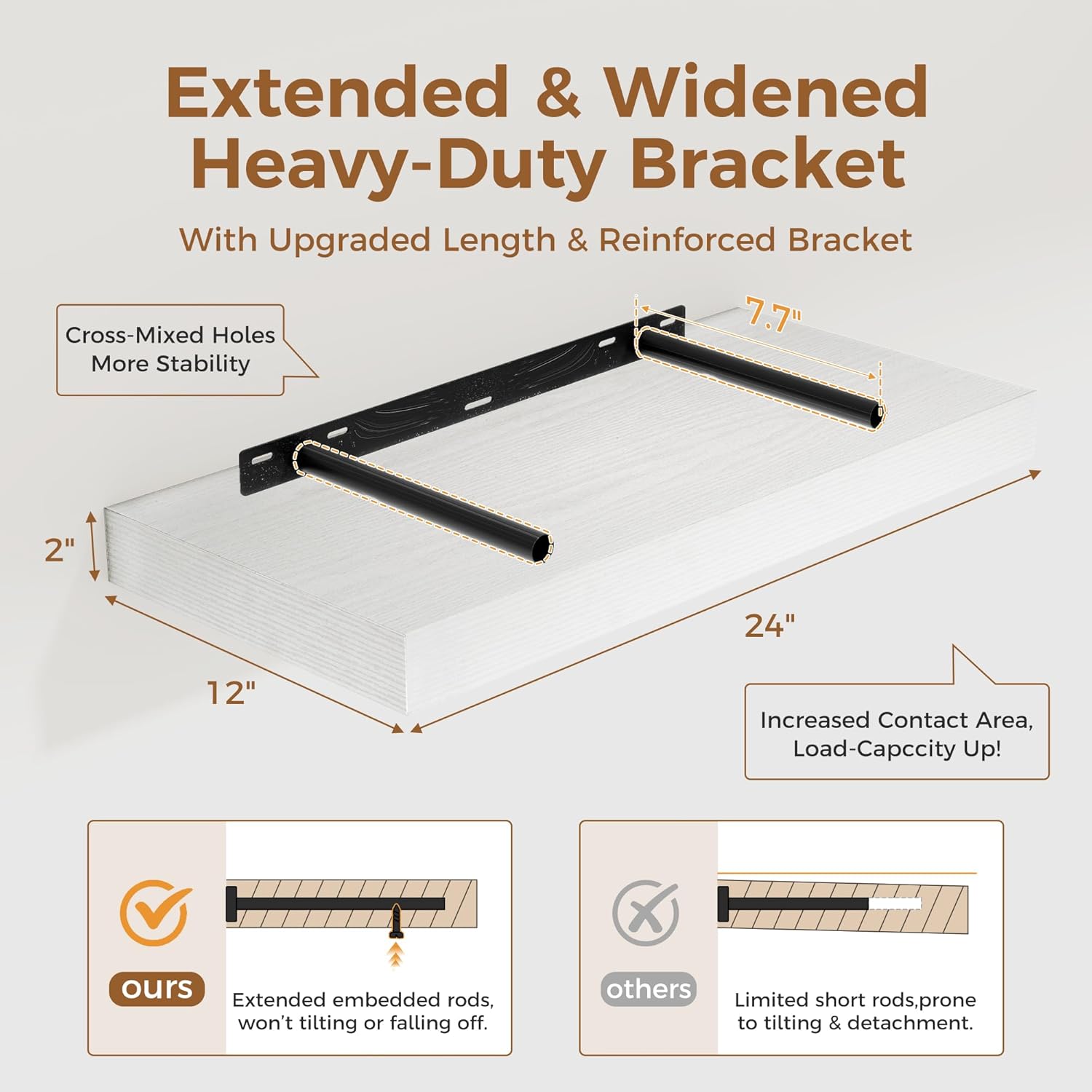 12 Inch Deep White Floating Shelves, 24 x 12 Floating Shelf for Books, Rustic Wood Deep Wall Shelves for Home Storage & Display, 2" Thicked Shelves for Kitchen, Living Room, Bedroom, 1 Pack