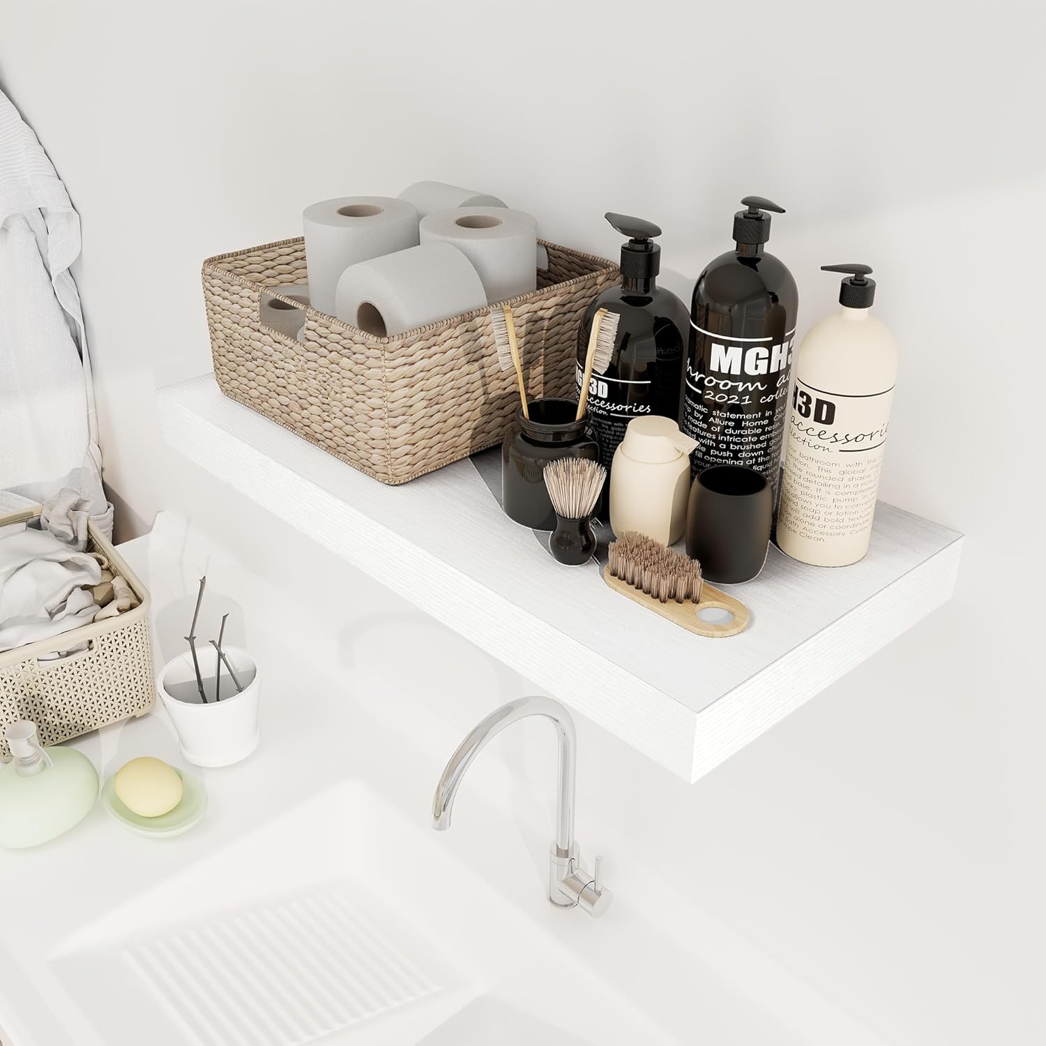 - ăDECORATIVE & FUNCTIONALăThe wall-mounted floating shelves are designed for decoration and storage, utilizing and decorating any space in your home. Used as shelf decor to show your collection, books, or prize, the hanging shelves are perfect for displaying your photo frame, small plants, model, or audio in your living room, office, study. And can also use as over the toilet storage shelf in the bathroom to hold toiletries or used as kitchen shelf to storage condiments.