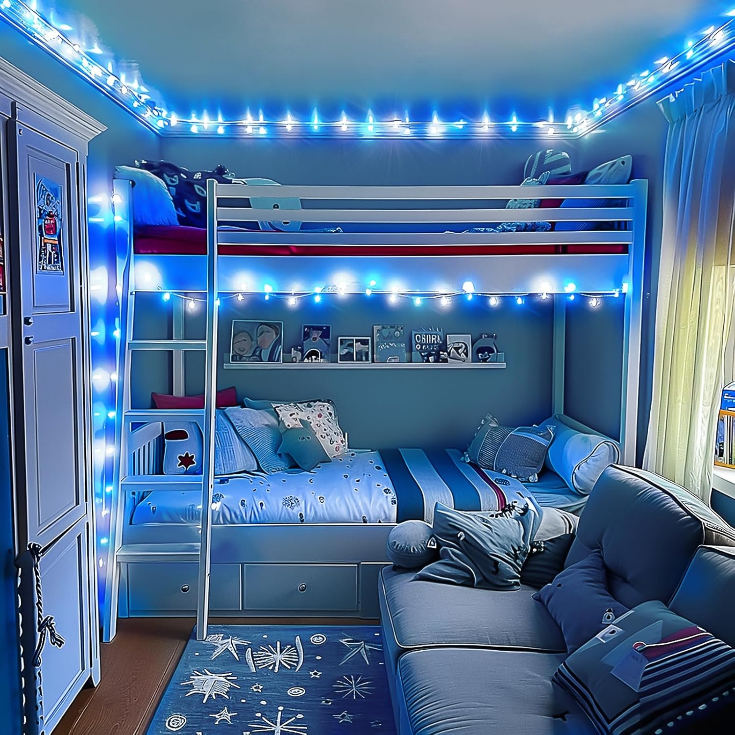 - 【Reel Design & Widely Use Christmas Decor Lights】 Our blue white led lights come with reels that can be easily removed or retracted. It can used to decorate your Christmas, create a delighted, joyful atmosphere for daily, thanksgiving day, Christmas party, Christmas tree, indoors and outdoors which can make your home become the most beautiful view in your neighborhood!