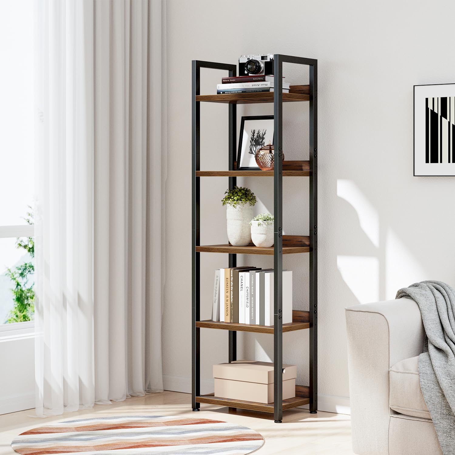 NUMENN Narrow Bookshelf, 5 Tier Bookshelves, Home Office Bookcase Shelf Storage Organizer, Free Standing Storage Shelving Unit for Bedroom, Living Room and Home Office, Vintage