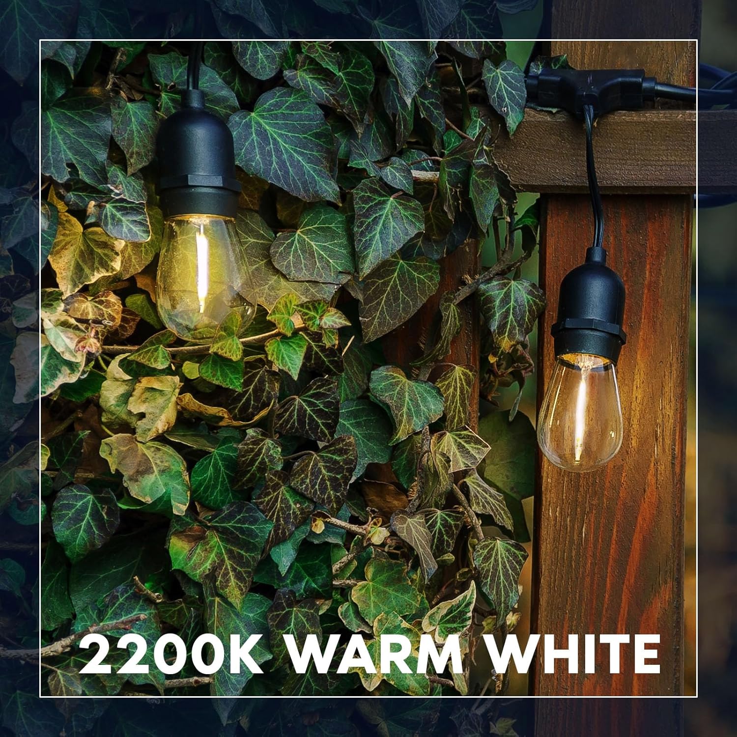 - VINTAGE STRING LIGHTS - Decorate your outdoors with beautiful string lights that will create the perfect ambience. Each strand has 12 hanging sockets with S14 edison LED bulbs included which are shatterproof (plus 2 spare bulbs) and emit a warm, gentle glow. The distance between each bulb is 2 feet and they each hang down 6.13 inches from the cable. A beautiful style that would be ideal for receptions and events or to decorate your garden, yard, pergola, gazebo, porch, deck, patio, and more.