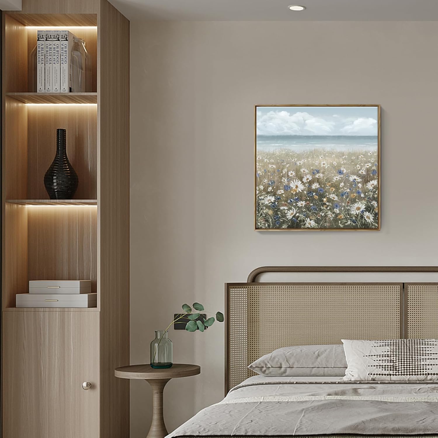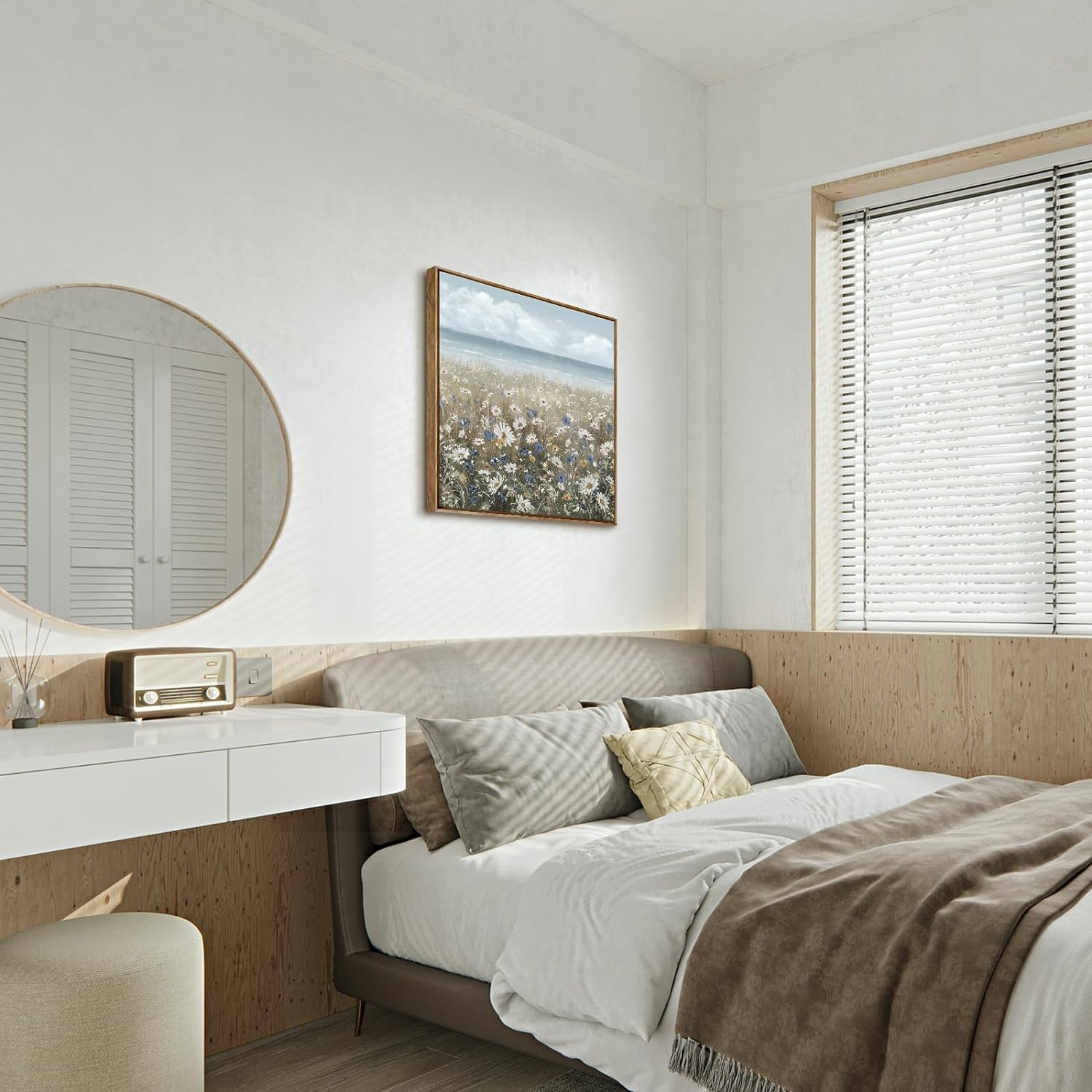 - ➤Bring a Beach Vibe to Your Space: This floral wall picture depicts a seashore covered with newly blooming wildflowers Daisy. The upper half of the flower wall art features a blue sky and a calm ocean in pale blue and grey tones for a fresh and breezy look. The lower half of the artwork is covered in a neutral palette of white, cream, and brown to complete this coastal farmhouse piece.