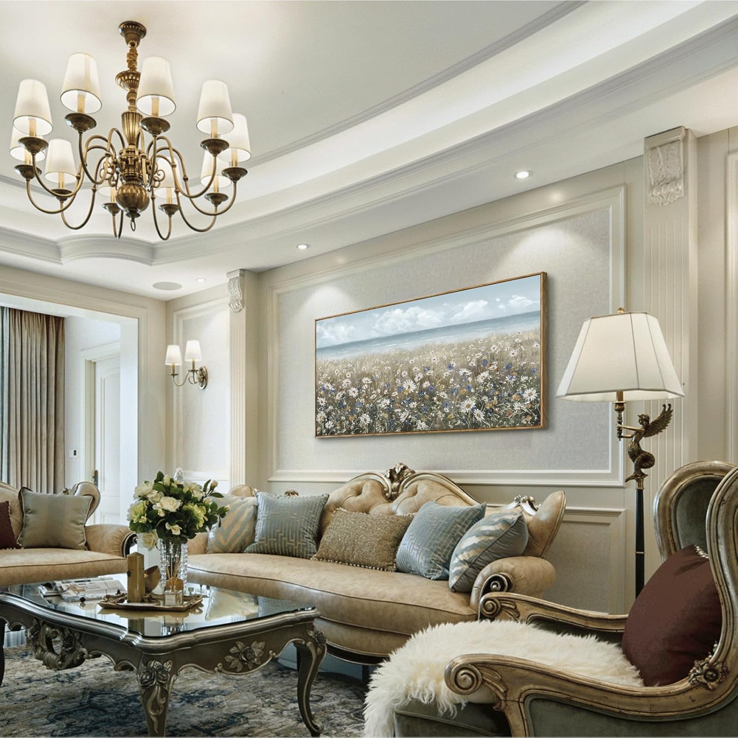 - ➤Bring a Beach Vibe to Your Space: This large floral wall art depicts a seashore covered with newly blooming wildflowers Daisy. The upper half of the canvas wall art features a blue sky and a calm ocean in pale blue and gray tones for a fresh and breezy look. The lower half of the artwork is covered in a neutral palette of white, cream, and brown to complete this coastal farmhouse piece.