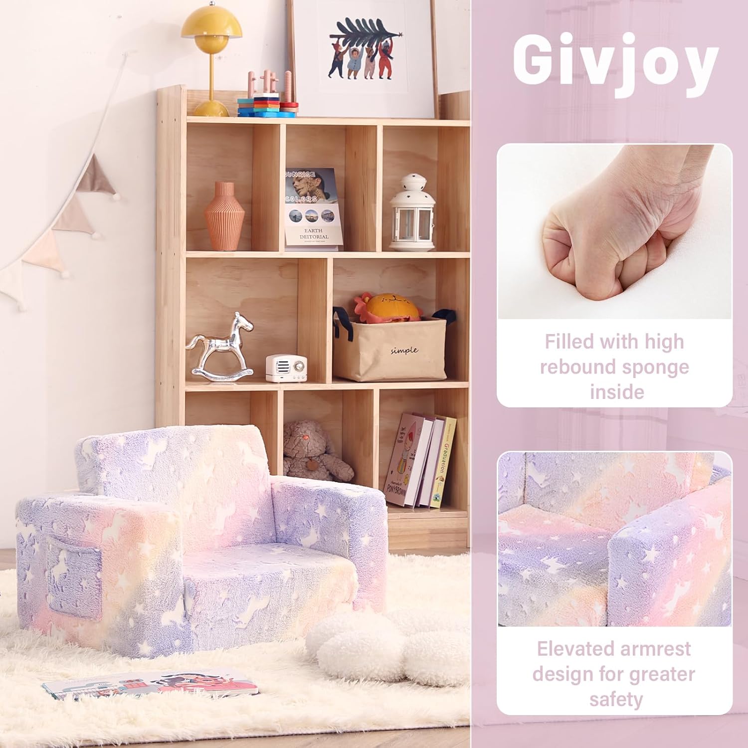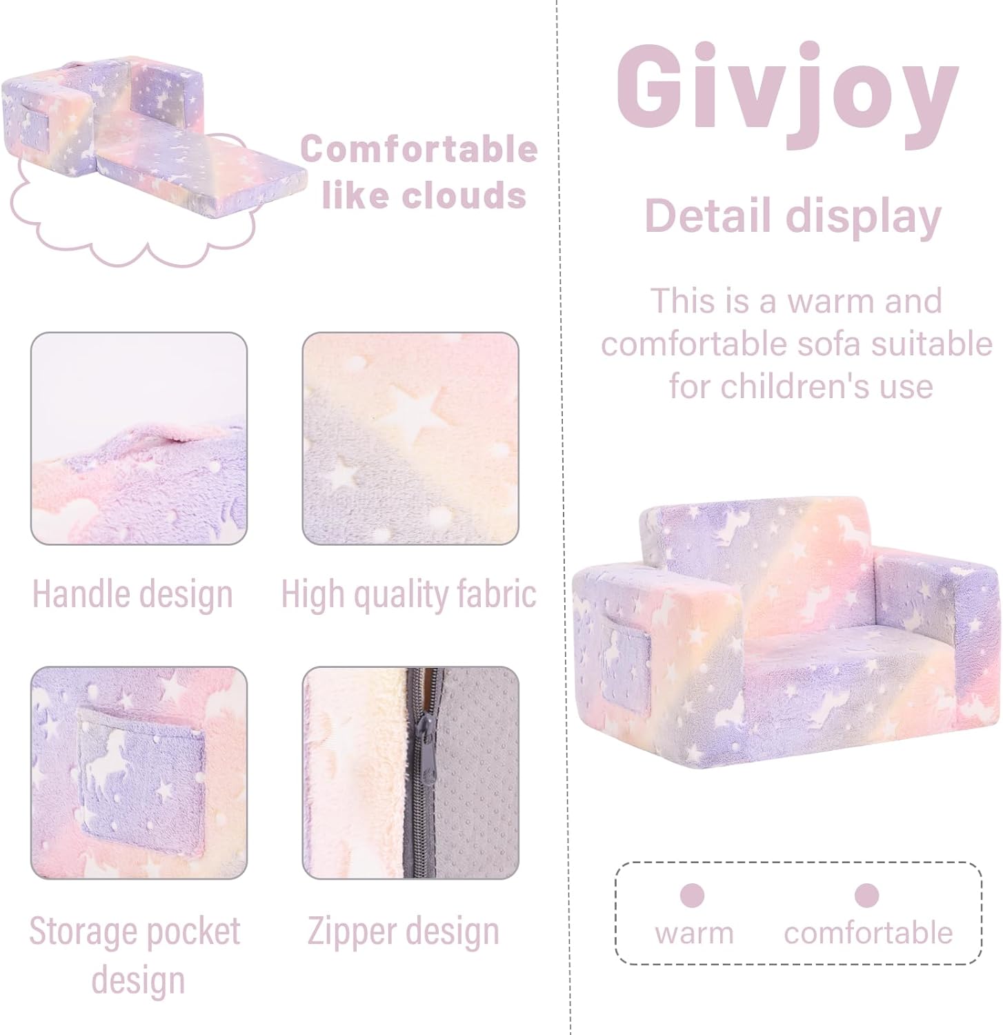 - ăSafe & Skin-friendly MaterialăThe cover of 2-in-1 kids sofa couch is made of high quality short plush which is durable and skin-friendly. High density and hardness of the supportive foam keep the sturdy toddler sofa couch in shape and provide our lovely kids all-day comfort. Its premium quality also ensures immediate expansion without needing a long wait.