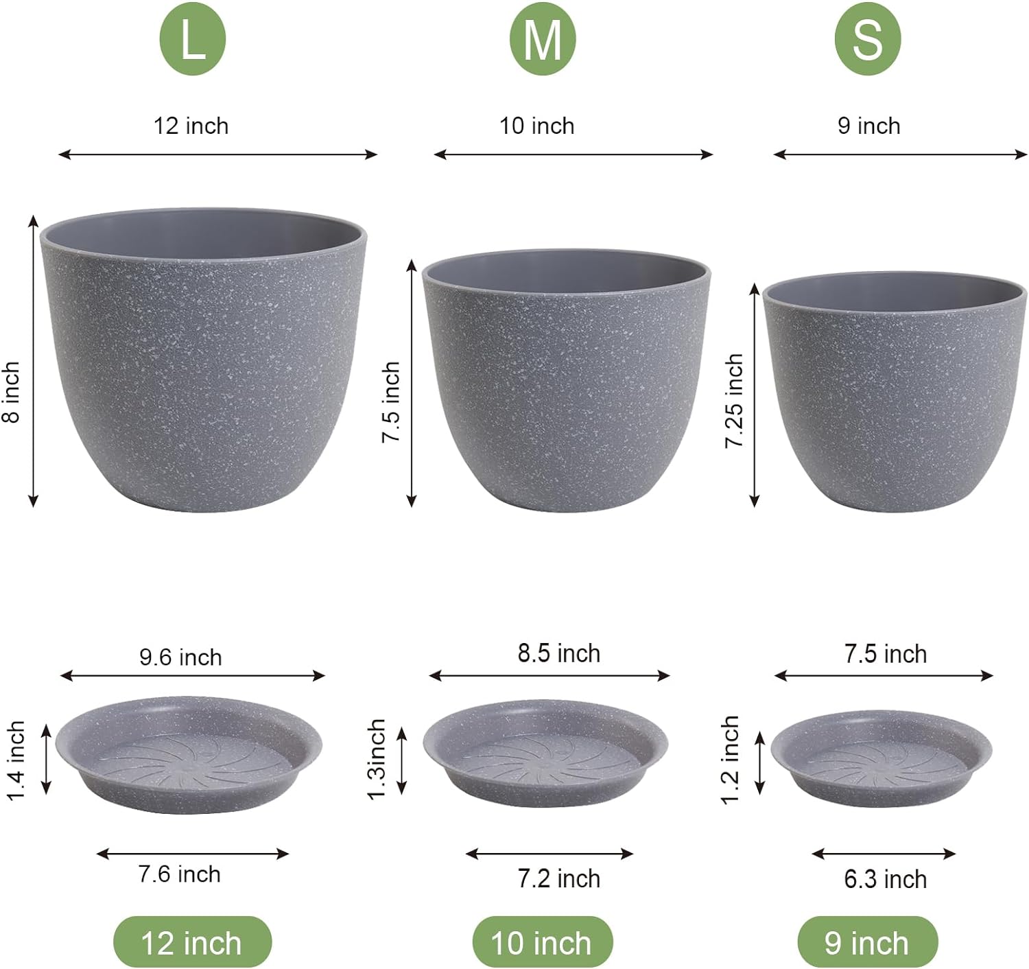 12/10/9 inch Large Plant Pots, 3 Pack Modern Decorative Plastic Planters with Drainage Holes and Saucer for House Garden Plants, Flower Pots for Indoor Outdoor Plants, Speckled Grey