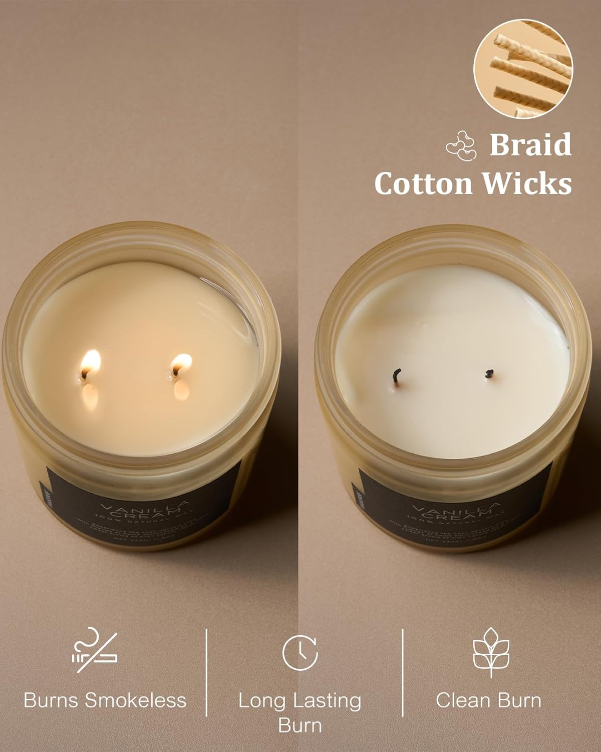 - π³ Clean Consistent & Even Burn - Using 2 American made lead-free cotton wicks for a even burn result. They're cotton flat braid wicks with paper throughout, providing increased rigidity and burn more consistently than 100% cotton wicks. Designed to reduce carbon buildup which leads to black soot.