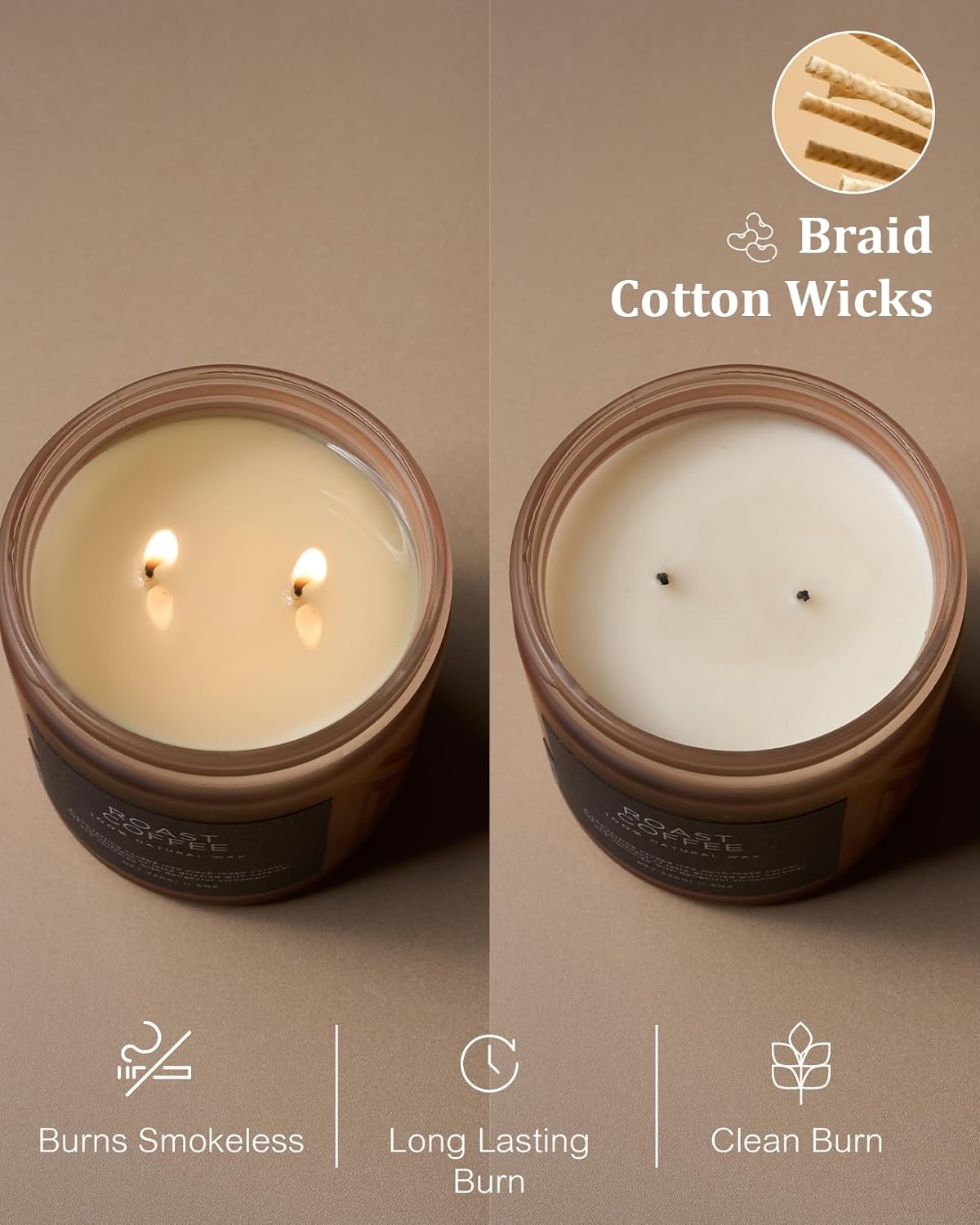 - π³ Clean Consistent & Even Burn - Using 2 American made lead-free cotton wicks for a even burn result. They're cotton flat braid wicks with paper throughout, providing increased rigidity and burn more consistently than 100% cotton wicks. Designed to reduce carbon buildup which leads to black soot.