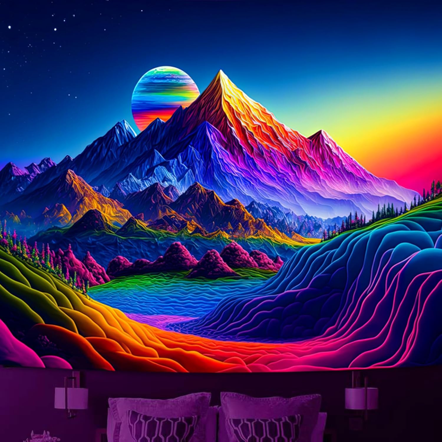 - IMMERSIVE EXPERIENCE: Experience a mesmerizing display of neon colors with our Sunset Mountain Tapestry under blacklight. Transform your bedroom or living space into a vibrant oasis with this UV reactive tapestry featuring a stunning forest lake scene.