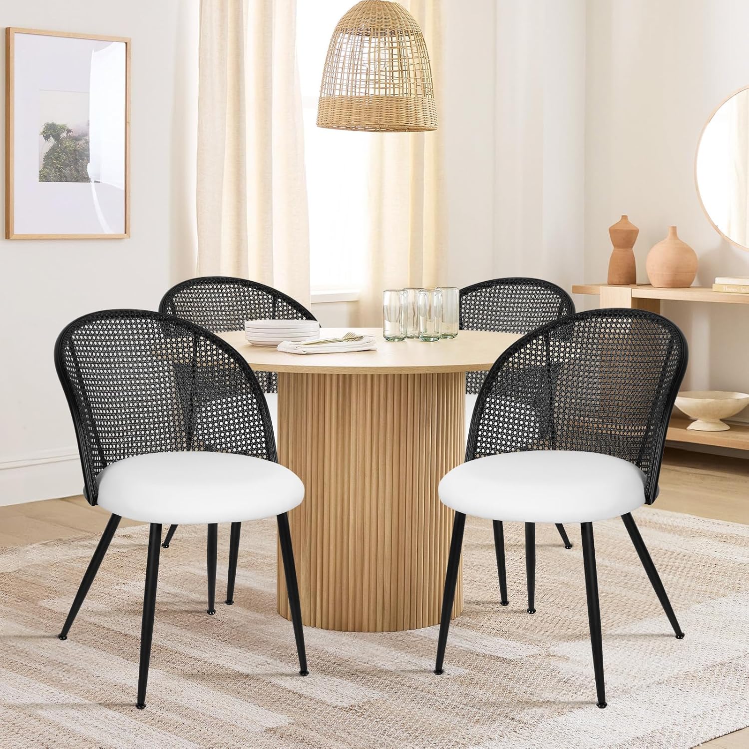 Rattan Dining Chairs Set of 4, Faux Leather Upholstered Dining Chairs with Black Cane Back, Mid-Century Modern Farmhouse Armless Accent Chairs for Kitchen Dining Room, Restaurant, White