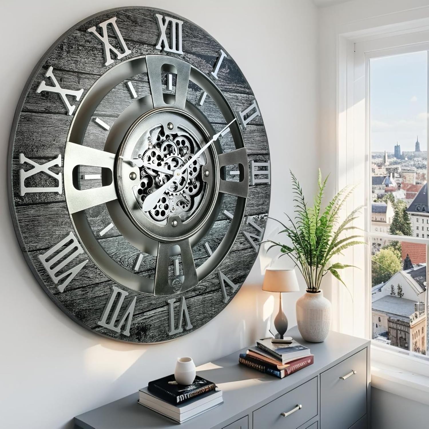 - MATERIAL QUALITY | The entire frame is made of Fir Wood, with embossed Silver Metal Numeral, and high Quality Plastic Silver with aged effect gears for vintage and industrial effect. Very Strong personality.