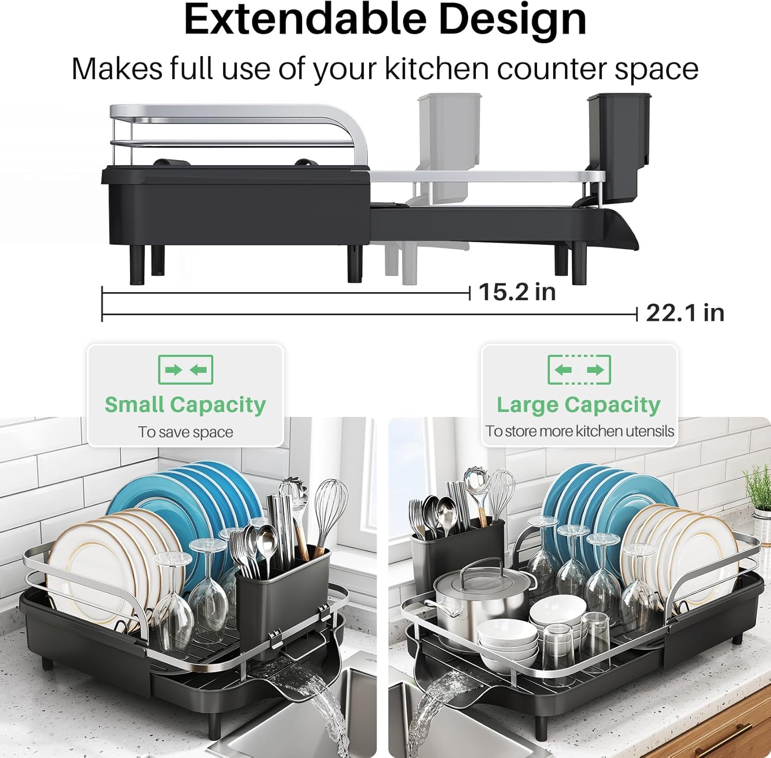 Dish Drying Rack, Expandable Dish Rack for Kitchen Counter, Stainless Steel Dish Drainer with Drainboard Set and Utensil Holder (Black)