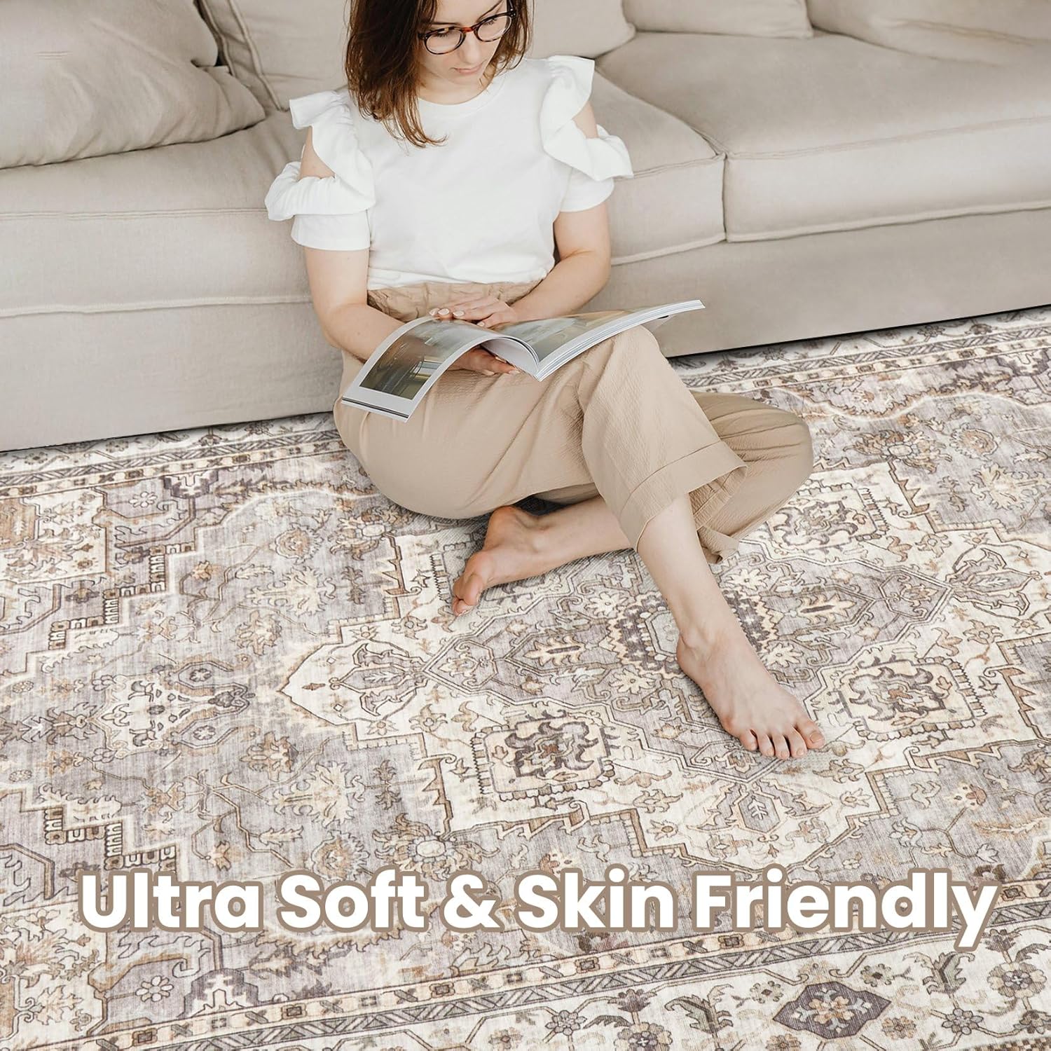 Washable Area Rugs for Living Room - 8x10 Neutral Vintage Distressed Floral Farmhouse Boho Large Soft Floor Rug Indoor Non Slip Carpet for Bedroom Dining Room Office - Grey Brown