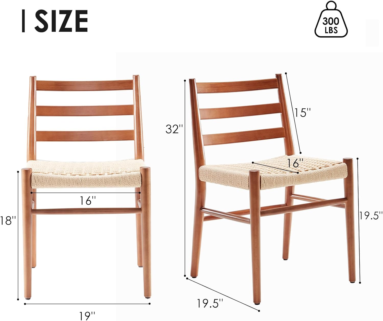 - Wood Chair Dimension: Total Dimensions: 18.5"D x 17"W x 32.1"H; Seat Dimensions: 16.1"D x 18.9"W; Backrest: 32.1"H (from floor), 13.2"H (from seat); Item Weight: 11 lb