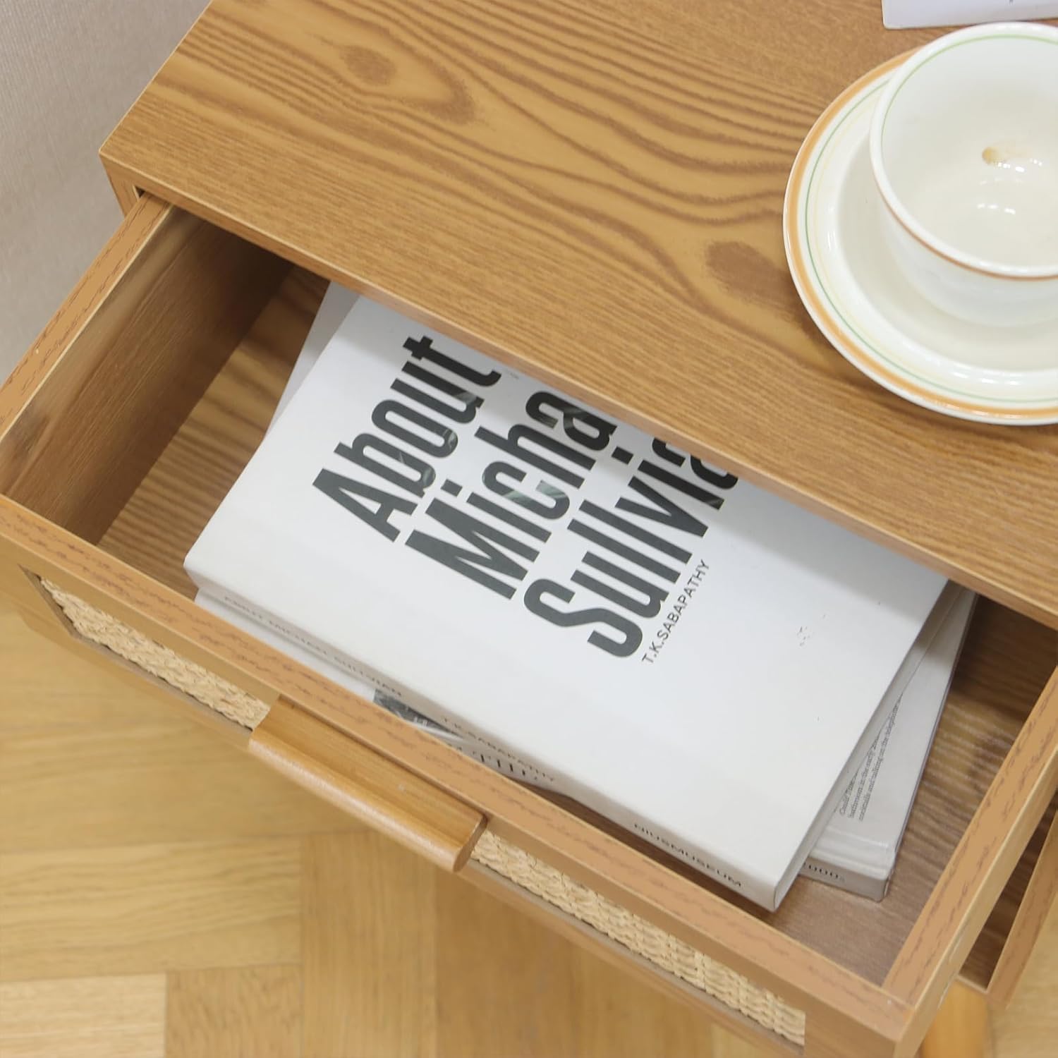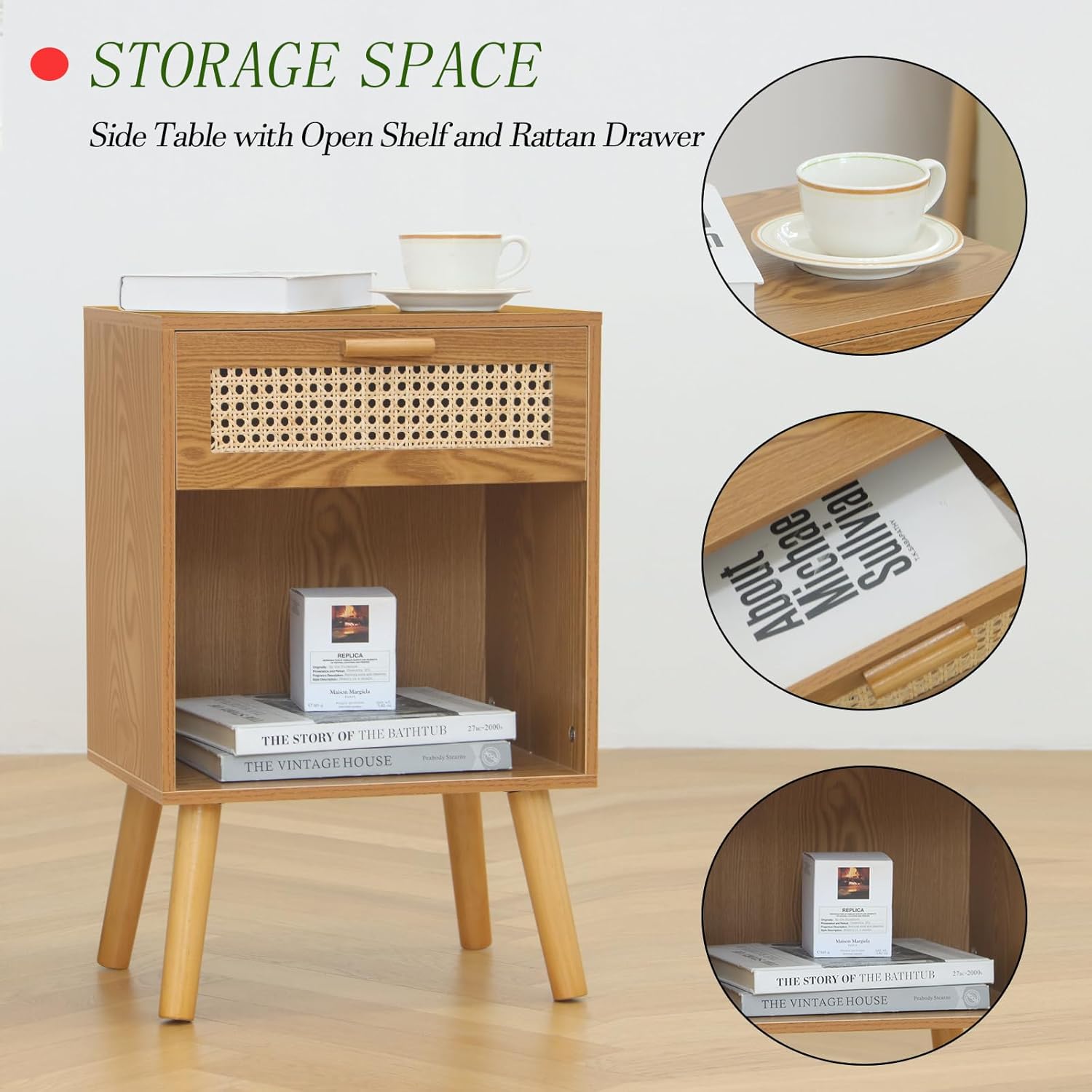 - Specifications & Service: The overall dimensions of the modern nightstand: 15.75''W x11.8'' D x 24.4''H. Rattan drawer: 13.7''Wx9.8''Dx4.2''H. Open shelf: 14.8''Wx11.4''Dx10.2''H. MaxSmeo team offer 24-hours after-sales service, we are aimed to provide a wonderful shopping experience