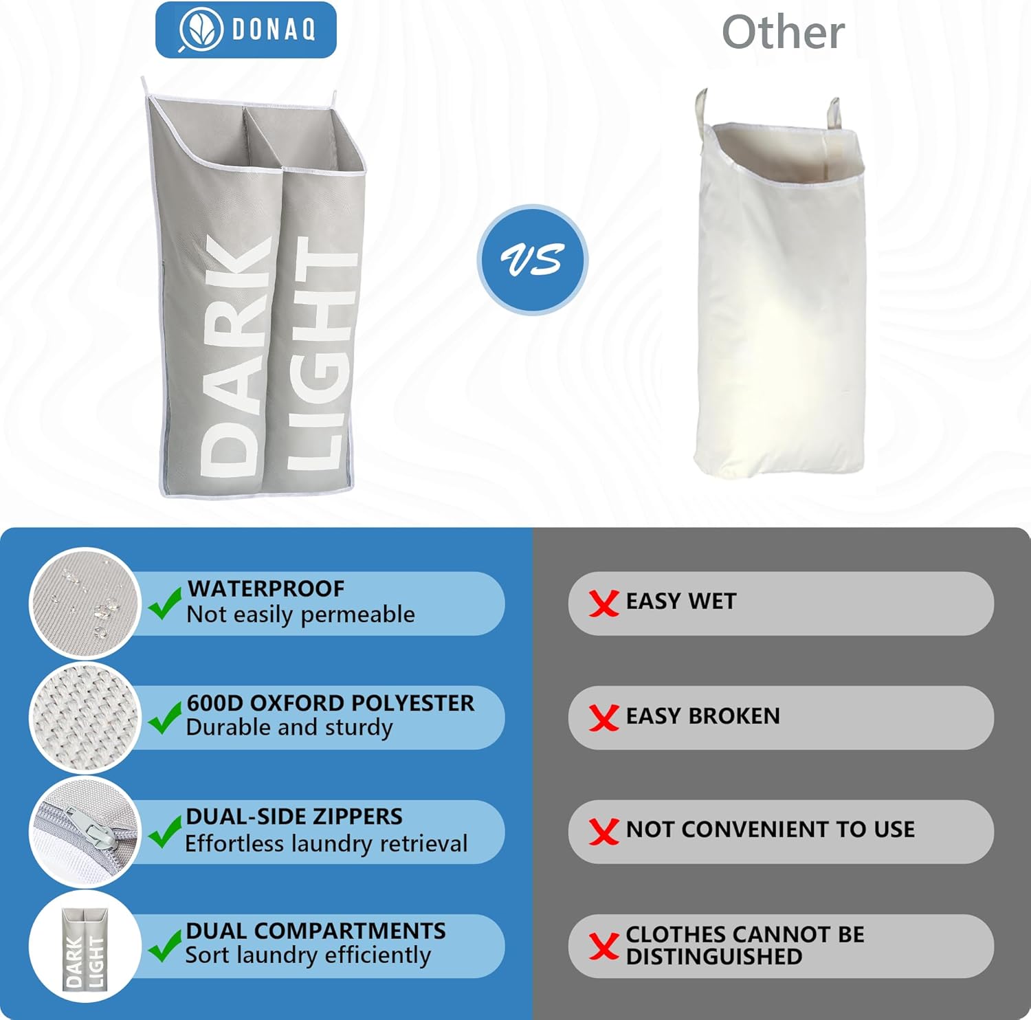 - Closure Type : The hanging laundry hamper typically features a zipper closure type, allowing for easy access to unload laundry while securely containing items to prevent spills or loss. The hanging laundry hamper typically features a zipper closure type, allowing for easy access to unload laundry while securely containing items to prevent spills or loss.