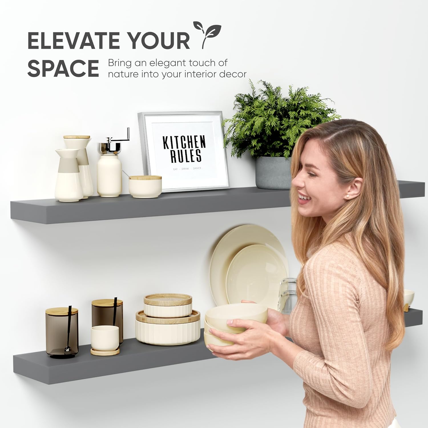 Homeforia Gray Floating Shelf 48 inch, High End Solid Real Wood 48inch Floating Shelves for Wall Mounted, Grey Wooden 48 inches Long Floating Shelves, Heavy Duty Bracket, 48 X 6.5 X 1.75 in, Set of 2