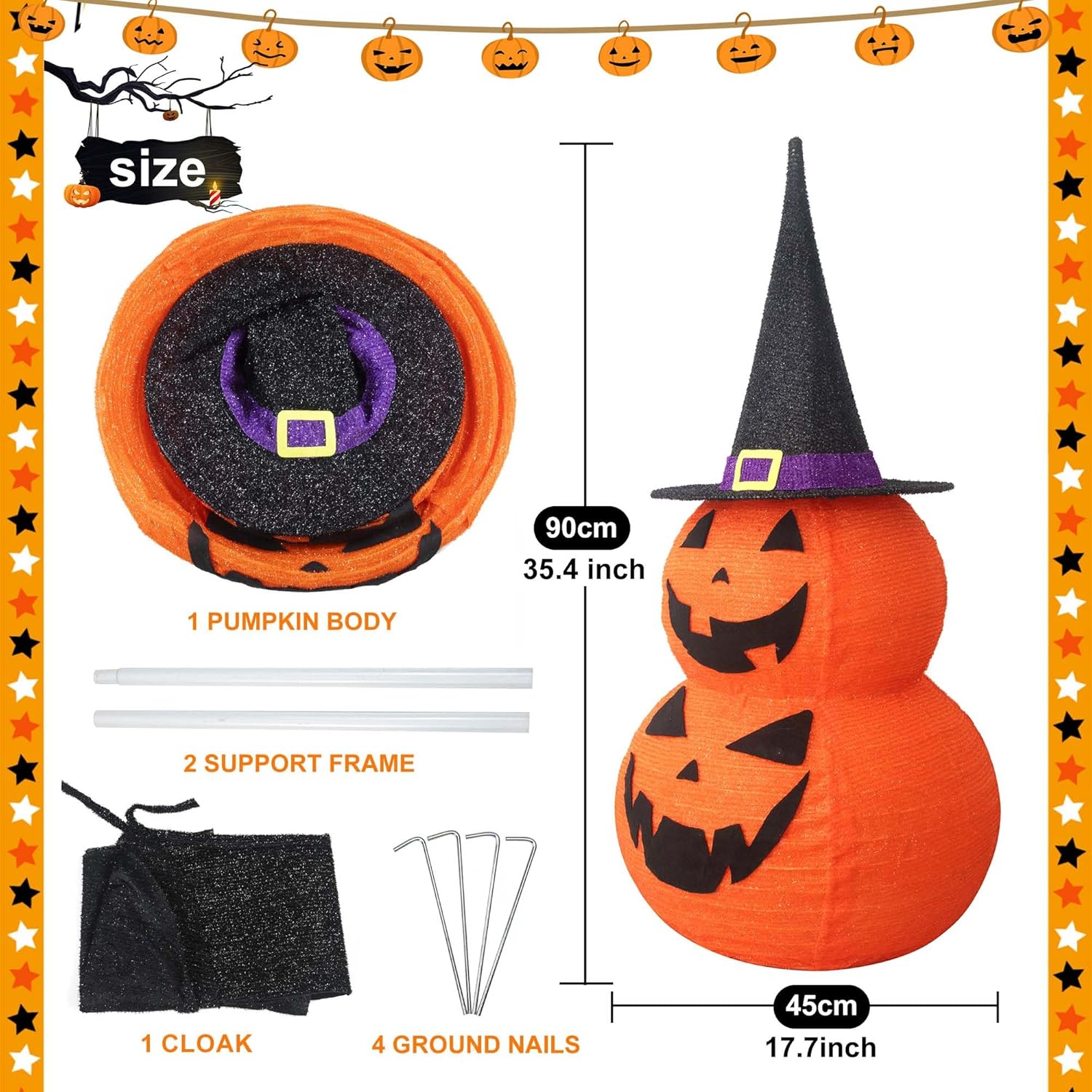 - Package Include: 1 x Collapsible pumpkin, 2 x support poles,1 x black cape(DIY cut),1 x big round base,4 x ground nails,1 x transformer. The installed height is 3 Ft(about 0.9 m).