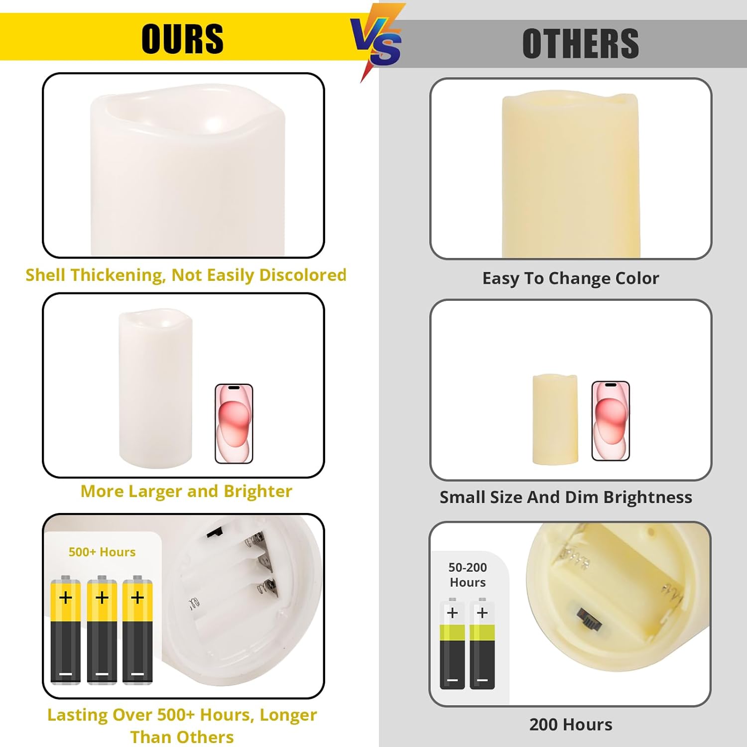 - LONG-LASTING GLOW WITH WARM LIGHT: Our remote candles adopt LED bulbs that emit a bright warm yellow light, with a flickering glow like real natural candlelight. Each candle requires 3 x AA batteries (not included), and with premium batteries, the battery candles can provide continuous lighting for over 500 hours or up to 45 days with high-grade batteries in a 6-hour timer.180-day after-sales guarantee and 24-hour customer service to assist with any questions or concerns