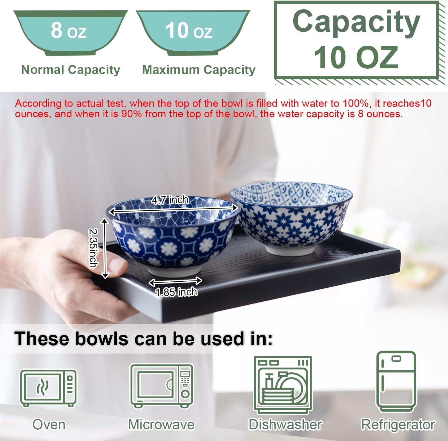 - 🌟Perfect Size for Small Servings🌟AntoKueh 4.7 inches Porcelain Bowls have a MAX capacity of 10 fl oz. 10 oz is to the very top. Each small bowl can hold 7-8 fl oz, which is perfect for sides, cooking ingredients, 2 scoops of ice cream, small soup, salsa, fruit, jello, pudding, yogurt, etc. Product Dimensions: 4.7'' W x 2.25'' H.