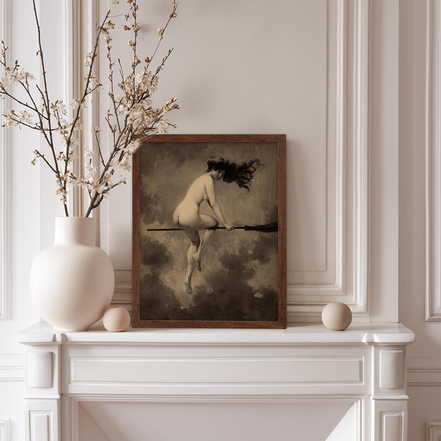 Poster Master Vintage Albert Joseph Penot Poster - Retro Halloween Print - Gift for Artist, Friend - Departure for the Sabbath, Naked Witch on Broom - Wall Decor for Bedroom, 8x10 Brown Framed