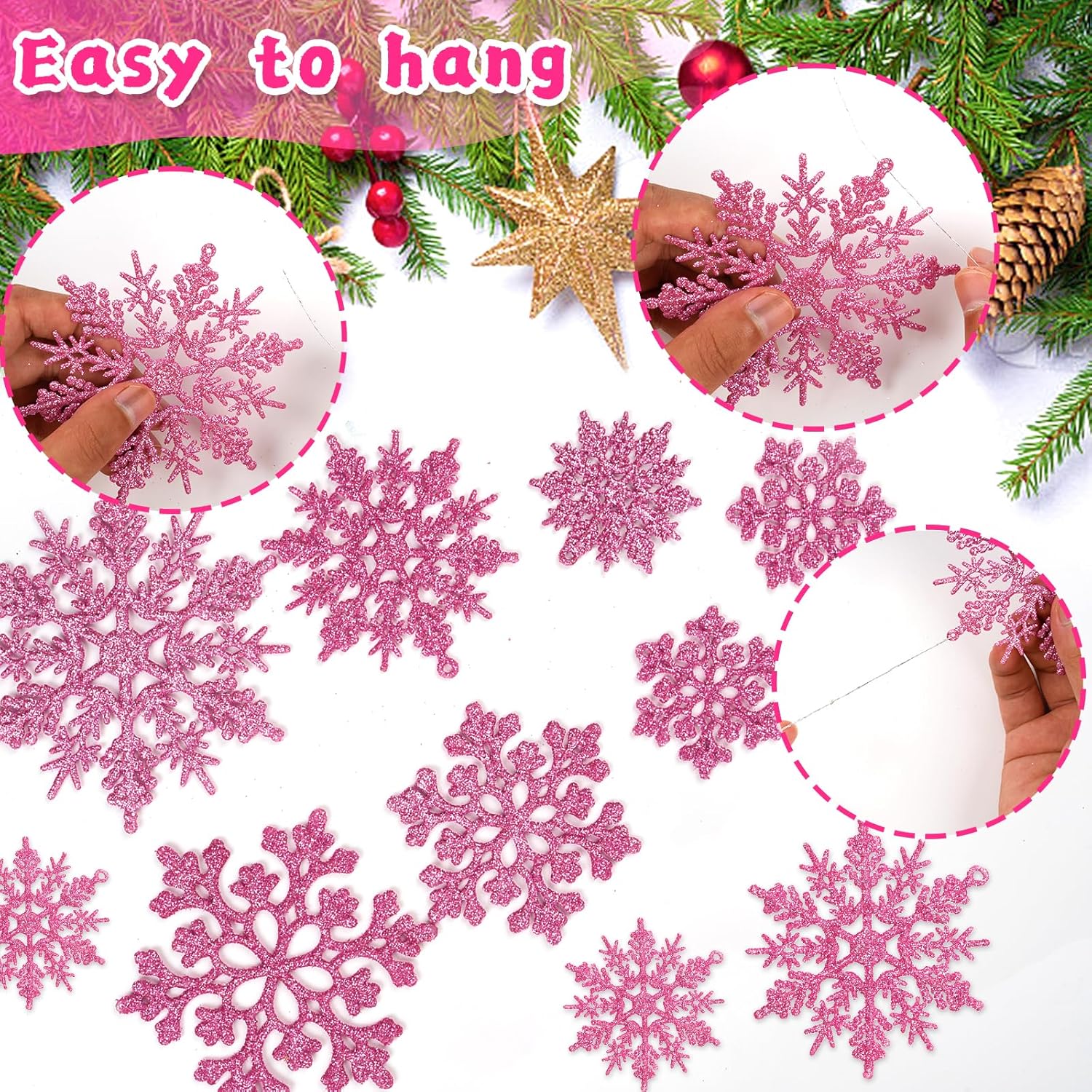 - CHRISTMAS TREE SNOWFLAKES: Featuring sparkly glitters on the surface, these light pink snowflakes tree ornaments add much more sparkle to your Christmas tree decorations, various sizes give a nicer variety on the tree, just let it snow.