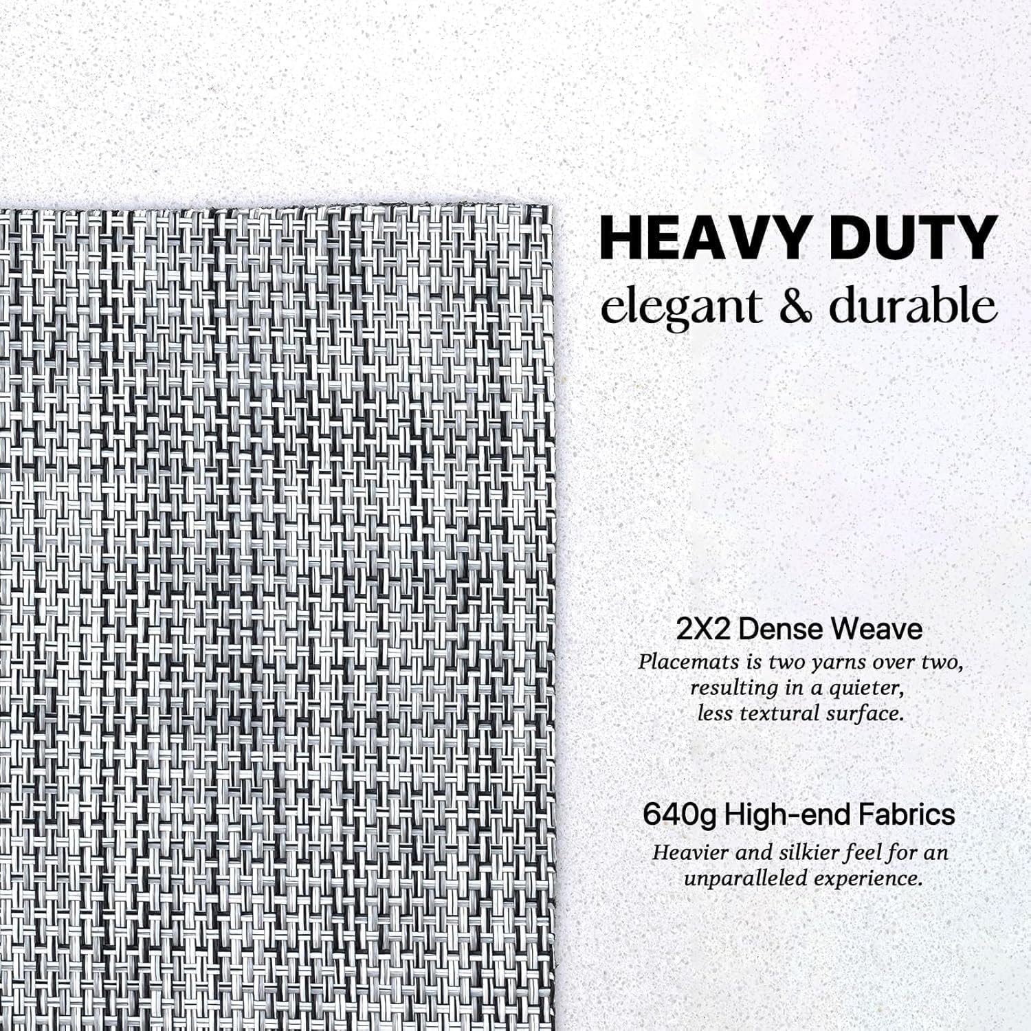- HEAVY-DUTY:We uses the German-imported higher grammage vinyl material (Specialty PVC)than other placemats on the market,plus the precise,dense weave craftsmanship to give the woven placemats a thicker feel and make the place mats long-lasting.