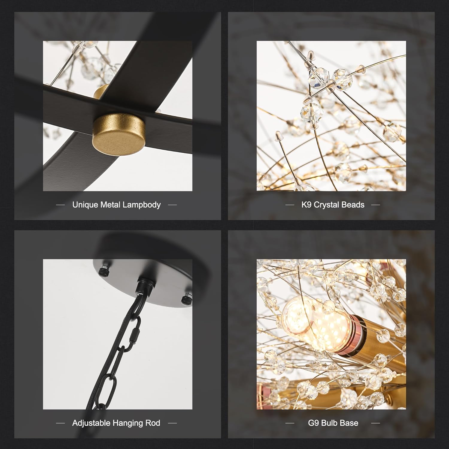 - 【Adjustable Height】This black gold globe light fixture diameter is 23.23 In(60cm). The canopy width is 4.72in (12cm). The cable length is 78.74in(200cm), can be adjusted as you need. Made of metal and crystal.