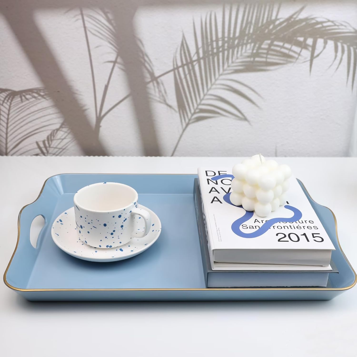 Spsyrine Light Blue Decorative Tray, Elegant Plastic Serving Tray with Handles, Coffee Table Tray for Ottoman, Living Room, Home Decor