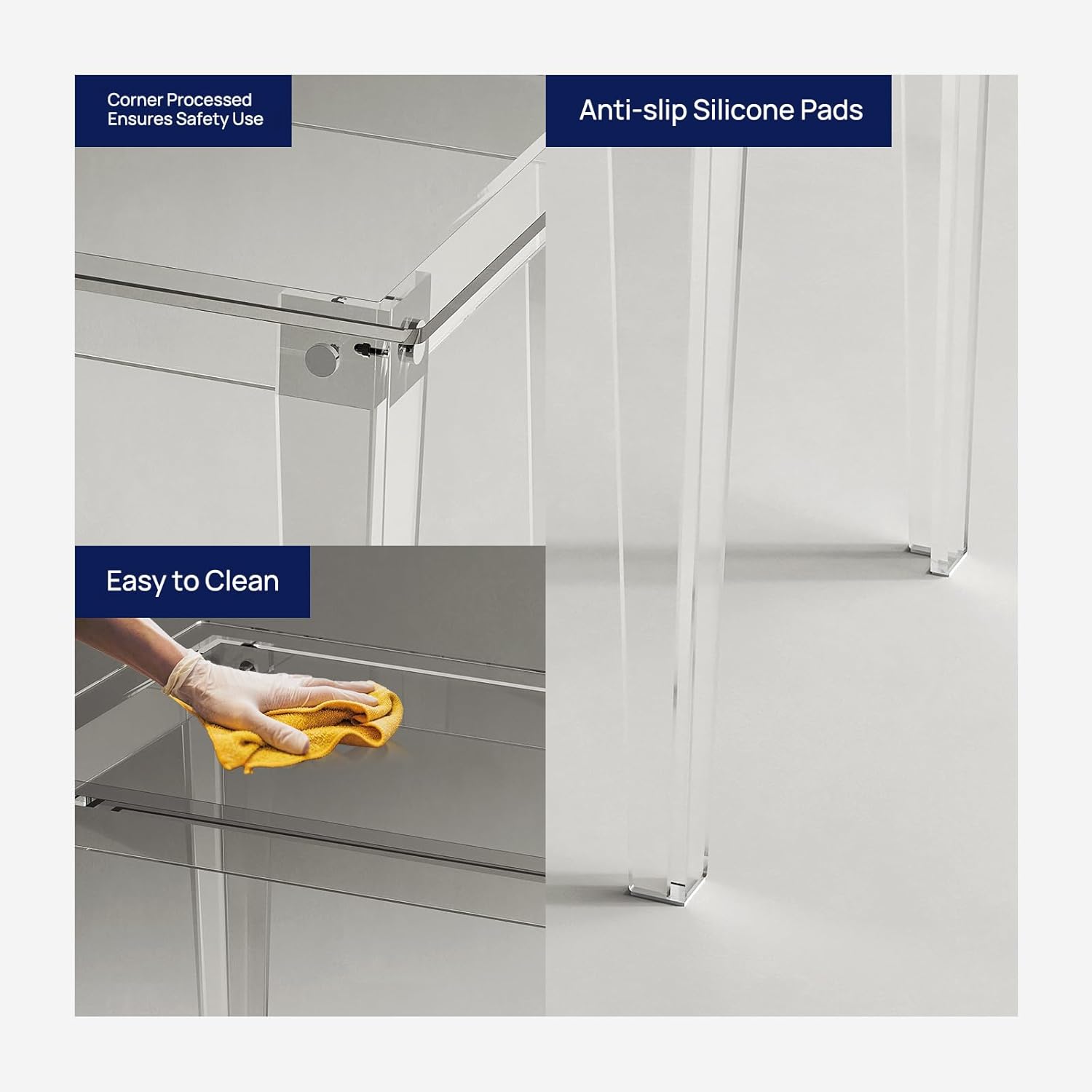 - Minimalist Style: Transparent acrylic desk with Right-Angle legs, simple & modern. Its unique design elements add a sense of modernity and sophistication into your living space. Round corner design and smooth edges, safety for use, especially for families with children.