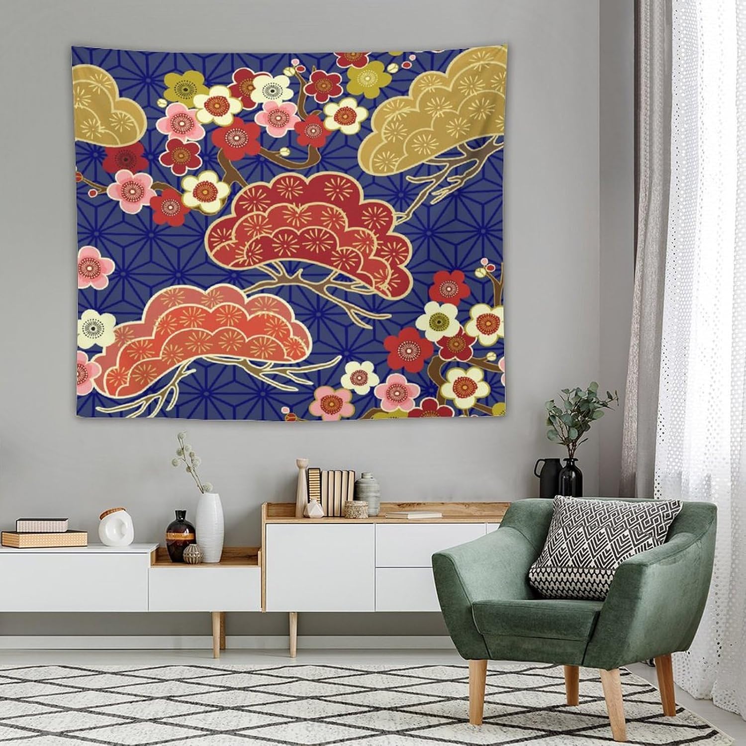 HZOHNAGO Japanese Tapestry Art Abstract Colorful Cherry Blossom Blue Background Pattern Printed Wall Tapestry Painting Wall Hanging for Bedroom Living Room Dorm 60" W x 50" H