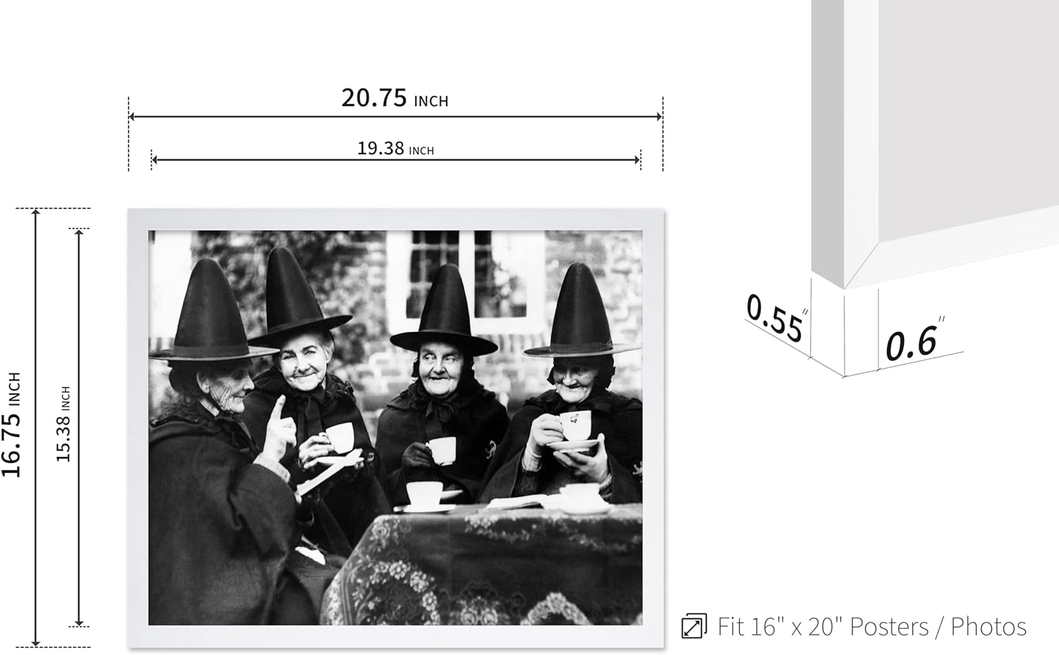 Poster Master Classic Photograph Poster - Vintage Halloween Print - Gift for Artist, Friend - Witches Tea Party, Old Women Smiling, Wearing Robes - Wall Decor for Living Room, 16x20 White Framed
