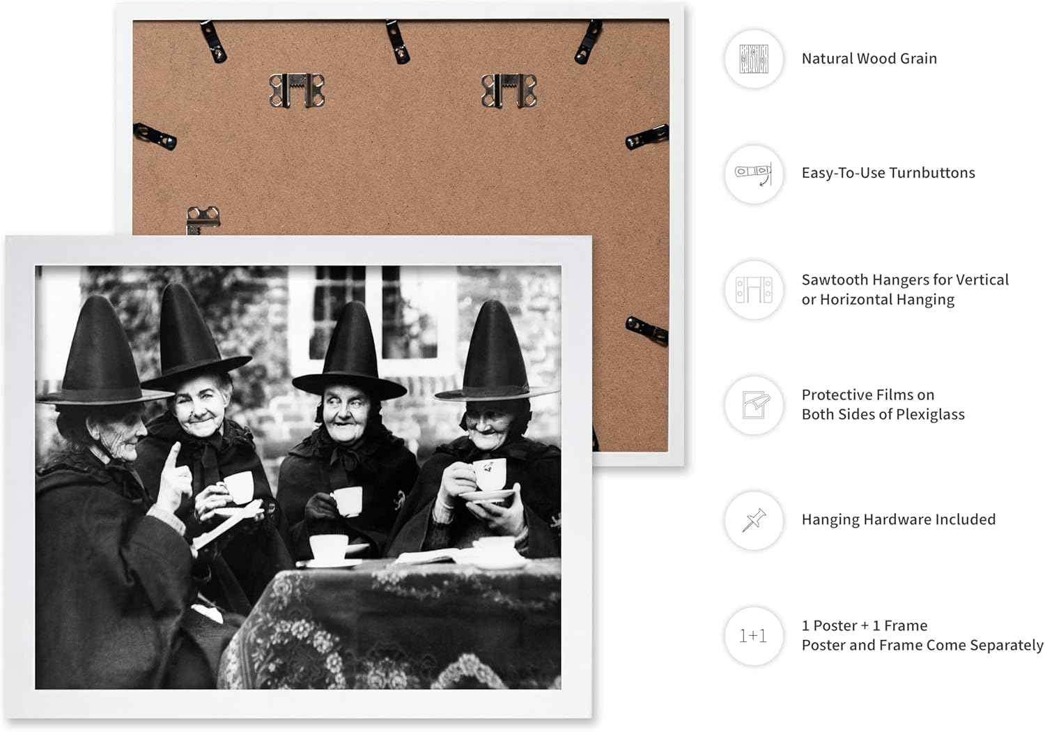 Poster Master Classic Photograph Poster - Vintage Halloween Print - Gift for Artist, Friend - Witches Tea Party, Old Women Smiling, Wearing Robes - Wall Decor for Living Room, 11x14 White Framed